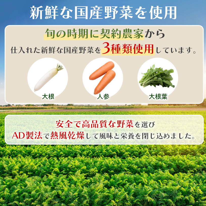 旬の時期に直接契約農家から仕入れた、新鮮な国産野菜をAD製法にて熱風乾燥してブレンドしました。熟練の職人が手作業で品質を確かめ、水分値や品質を管理。