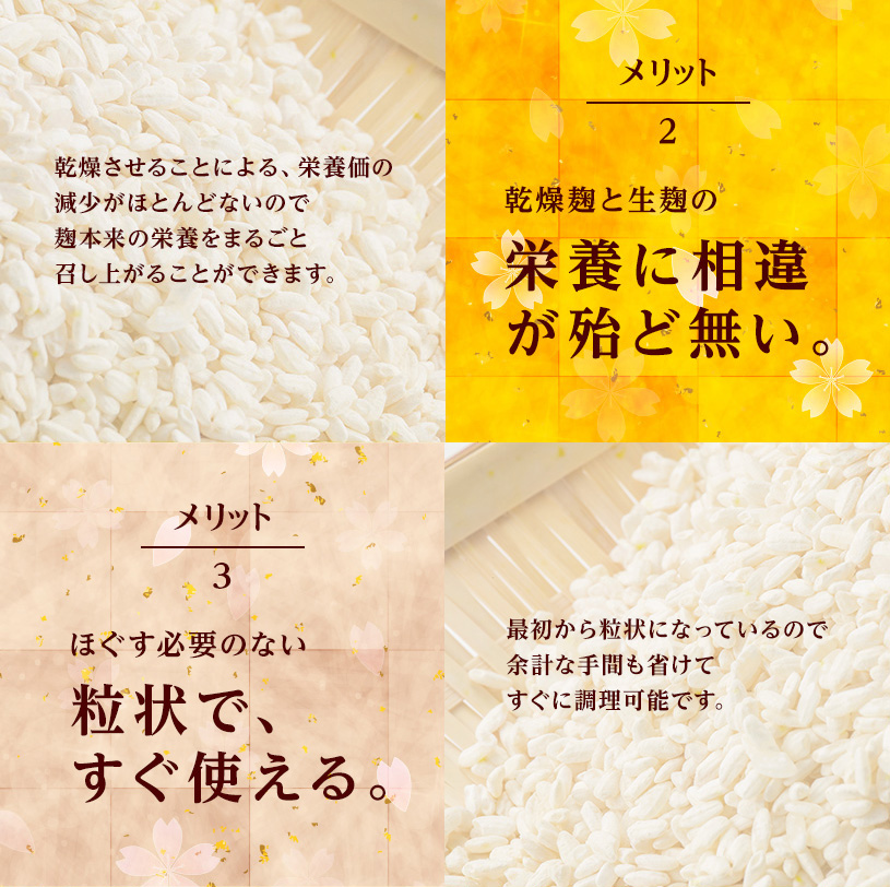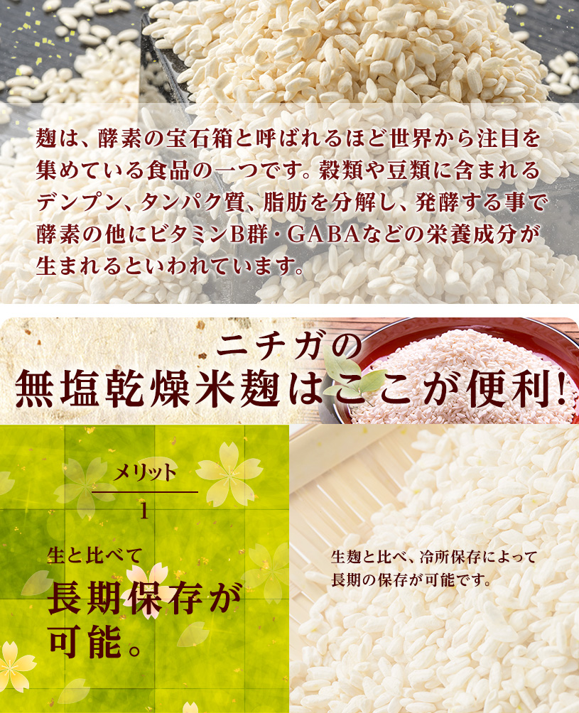 国内産の米100%で作られた無塩タイプの乾燥米麹です。生麹を乾燥させることで長期保存が可能になり、粒状なのでほぐす手間もなく、すぐにご使用いただけます。美味しい塩こうじ、味噌や甘酒づくりに手軽にご利用いただけます。