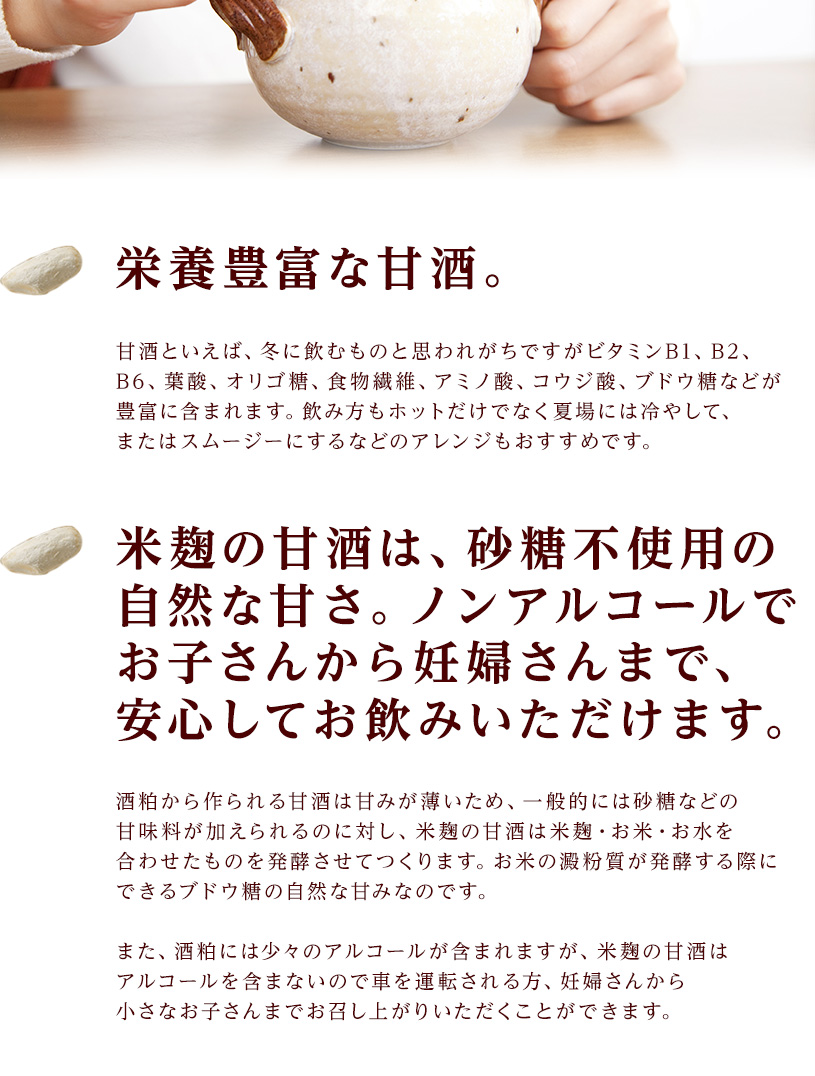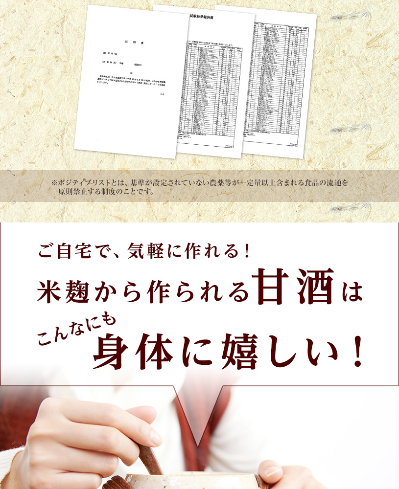 ○麹は非常に害虫がつきやすいため、購入後は冷蔵保存をお勧めします。開封後は湿気に注意して、チャックをしっかり閉めて保存し、早めにお召し上がりください。 ○天産物を原料とした商品であり、着色料、香料を使用いたしておりません。そのため製造ロットにより風味が異なる場合がございます。予めご了承ください。 ○原材料名をご確認の上、食品アレルギーのある方は召し上がらないでください。 ○乳幼児の手の届かない場所で保管してください。 |