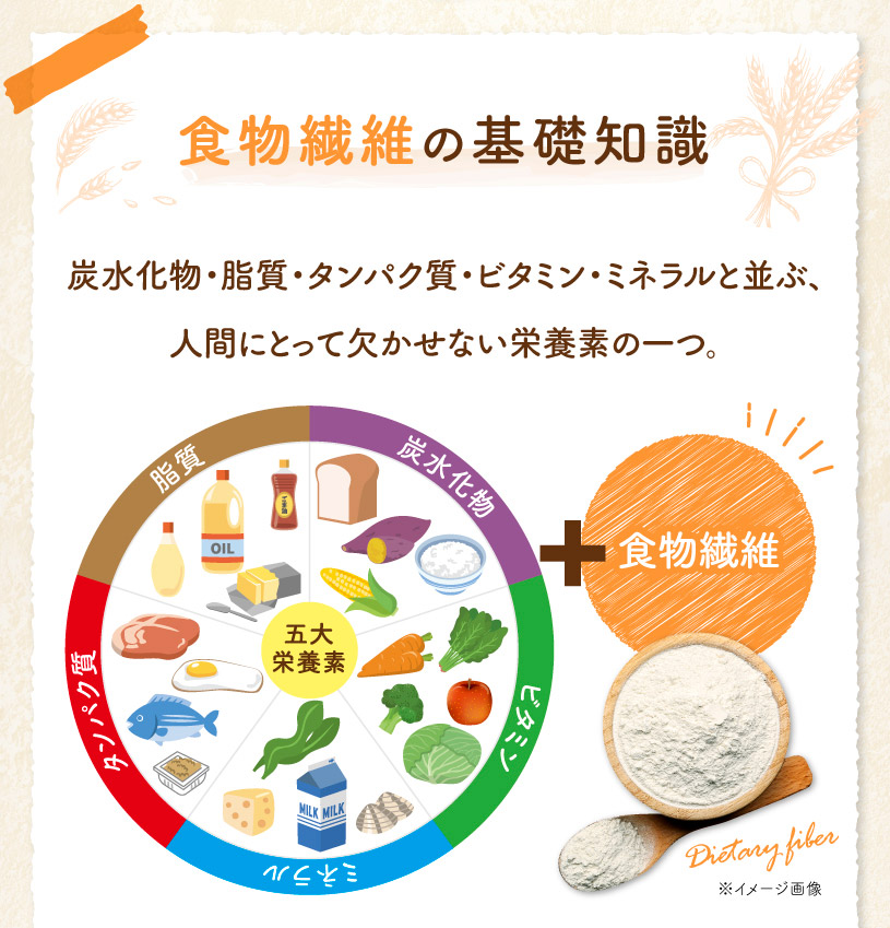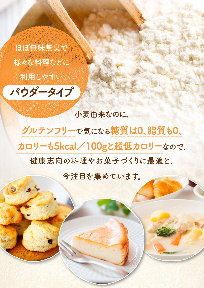小麦の茎由来の不溶性食物繊維で、グルテンフリー・糖質ゼロ・脂質ゼロの製品です。