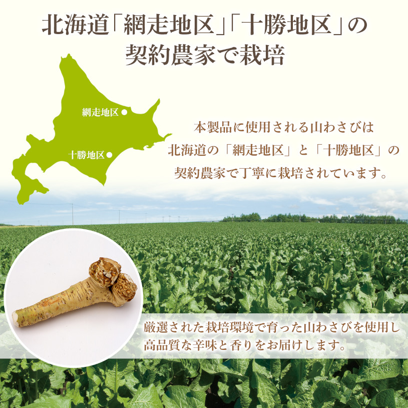 澄み切った空気と広大な北海道の大自然で育まれた山わさび使用。