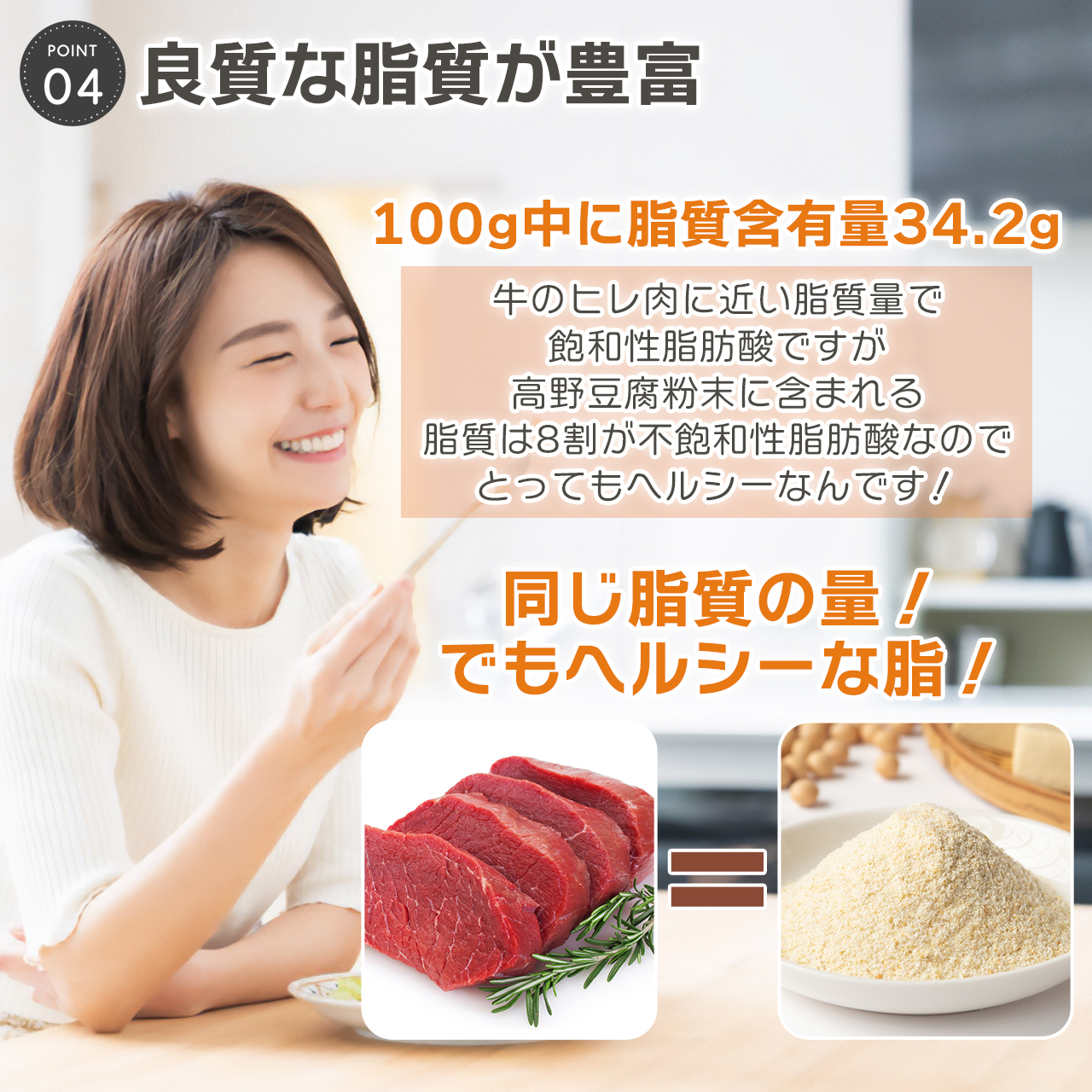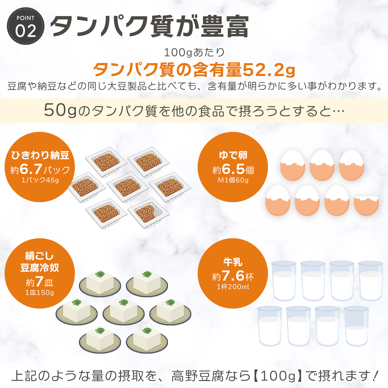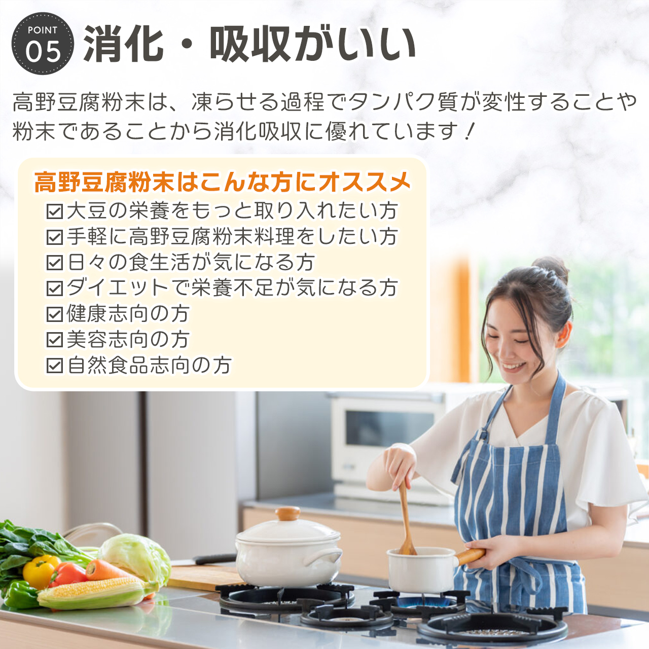 ○炒り豆腐、玉子焼き、ハンバーグなど様々な料理にご使用ください。 ○パンやクッキーなど小麦粉の代わりにもオススメです。 |