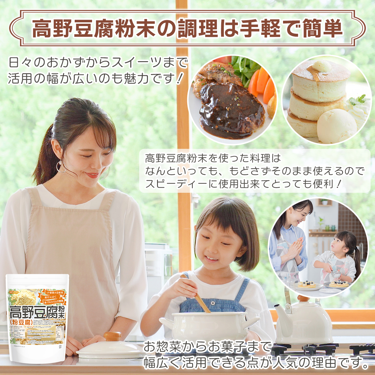 植物性タンパク質、鉄・カルシウムが豊富に含まれています。粉末ですので使い勝手がよく、お料理からお菓子まで幅広くお使いいいただいています。