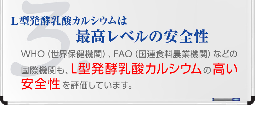 WHO(世界保健機関)、FAO(国連食料農業機関)のような国際機関が、L型発酵乳酸カルシウムの高い安全性を評価しています。