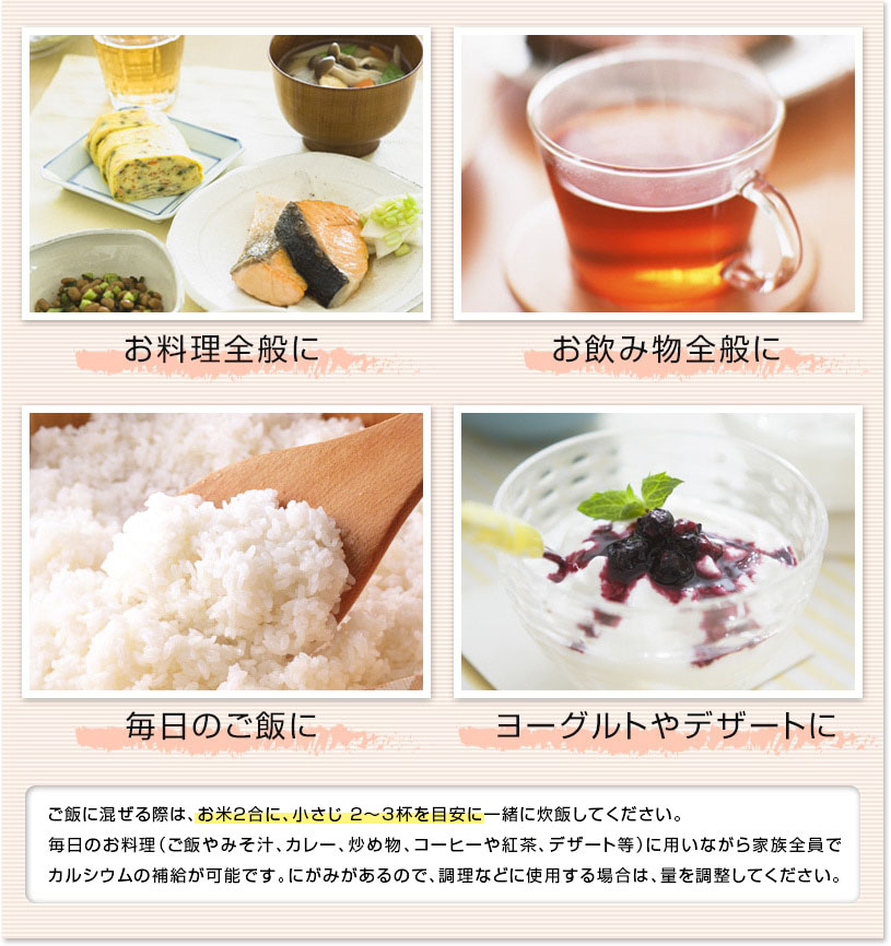 ・毎日の料理(ご飯やみそ汁、カレー、炒め物、コーヒーや紅茶等)に用いながら家族全員でカルシウム補給ができる食品です。 ・お米1合に対し、1g程度を入れて一緒に炊飯してお召し上がりください。 |