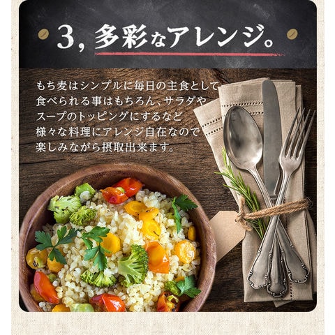 【大麦ごはん】 ⇒ 炊き方は簡単!洗ったお米に混ぜるだけ! もち麦量の2倍量の水を入れて炊飯してください。 (白米と混ぜる場合は、白米分の水量を追加し、もち麦と白米を軽くかき混ぜてから炊飯してください。) ※もち麦の割合は、3~5割、10割などお好みで調整してお召し上がりください。 ※事前に30~60分吸収させると、よりもちもちとした食感が味わえます。 【ゆで大麦】 ⇒ ゆでたもち麦を、そのままサラダやスープ、ドリンクとして! (1)鍋に水を用意(麦に対してたっぷりの水量)します。麦を加え時間があれば30分浸水。 (2)塩(お好みで)を加え、沸騰したら軽く混ぜ15~20分、お好みの硬さに茹でます。 火加減は吹きこぼれるといけないので注意してください。麦が軽く対流する位が丁度良いです。 もち麦の中心が透明になるまでゆでて下さい。 (3)お好みの硬さに茹で上がったら湯を切り流水でぬめりをよく洗い流します。水分をしっかり切ってください。 2~3日なら蓋つき容器に入れて冷蔵庫、それ以上の場合は小分けにし冷凍保存します。使用するときはレンジまたは湯通ししてください。 |