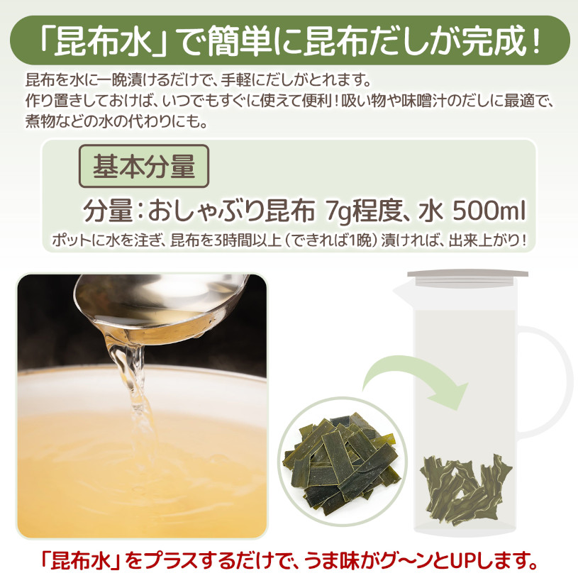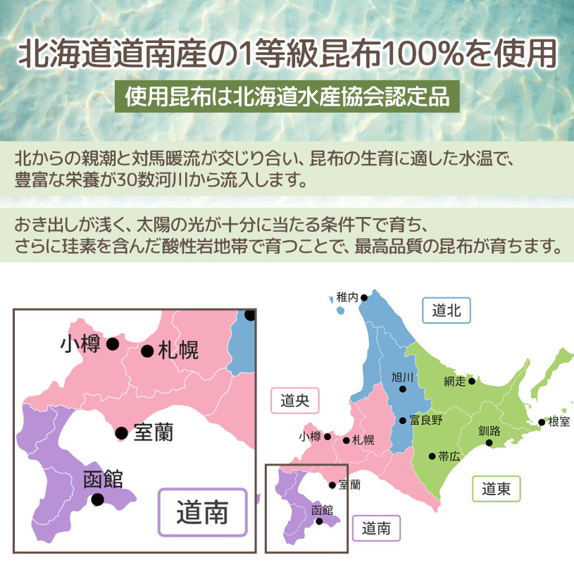 北海道道南産の1等級昆布100%使用しております。昆布そのものの味を楽しんでいただくために、調味料一切使用しておりません。