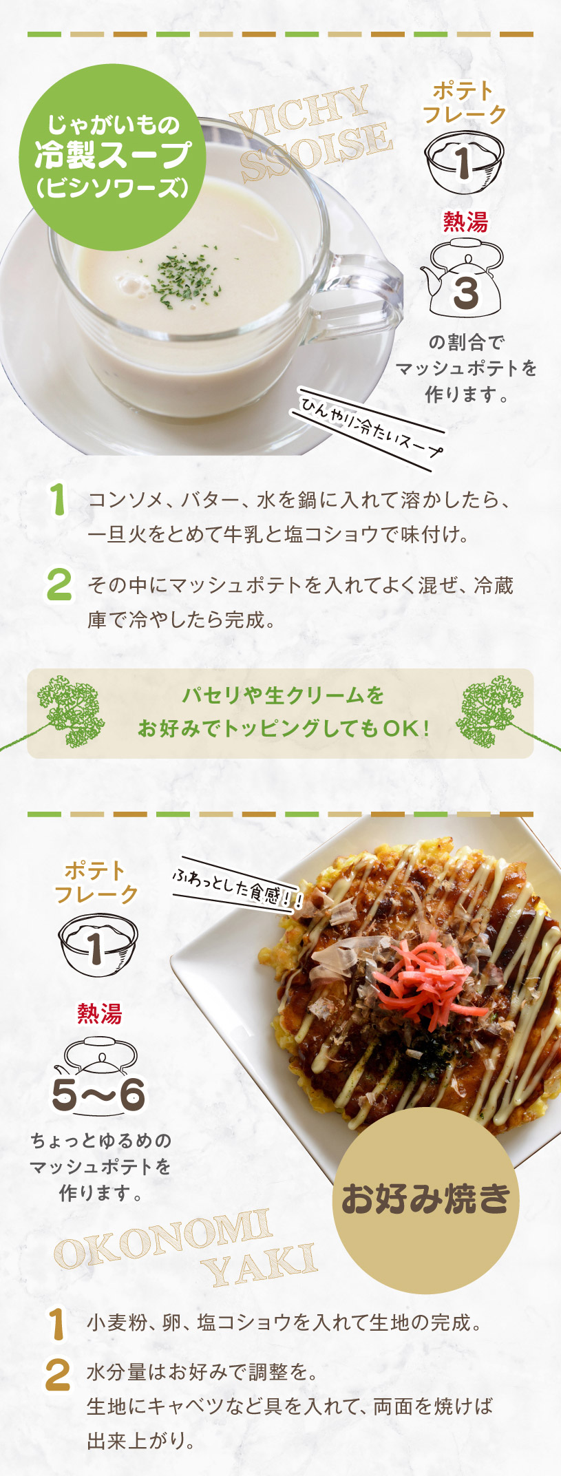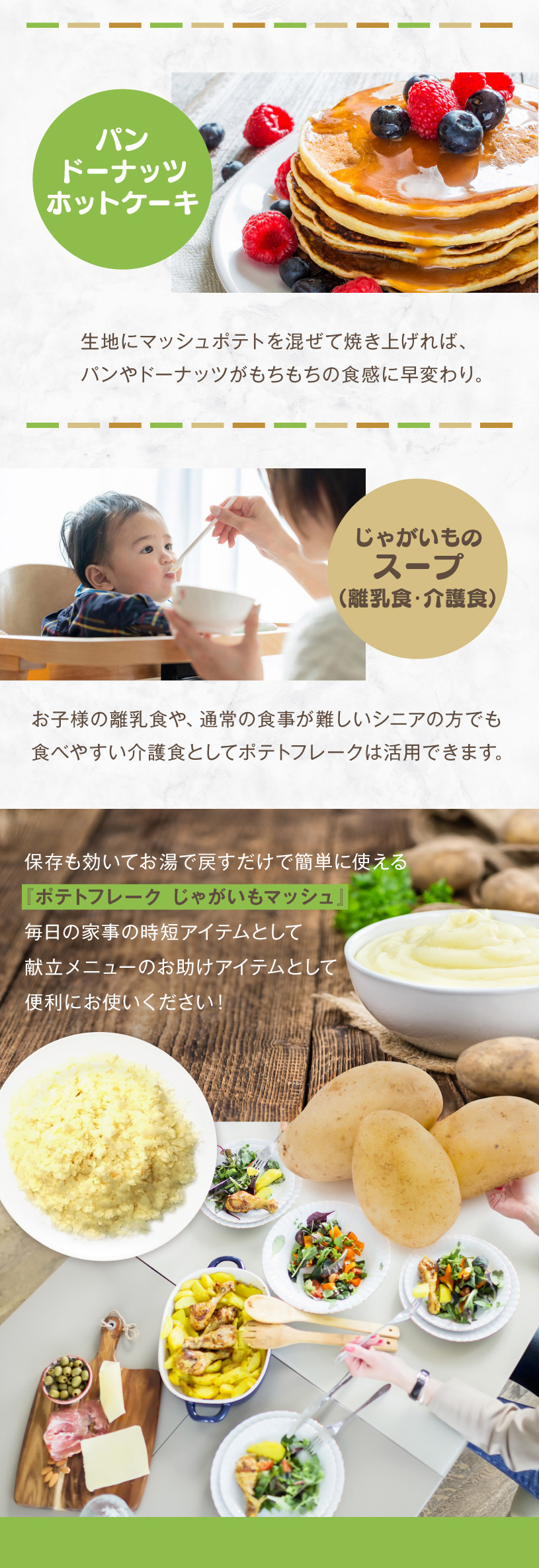 お魚料理や、肉料理の付け合わせ、サラダ、スープ・離乳食(ベビーフード)・介護食・常備食に幅広くご利用頂けます。 <マッシュポテトレシピ>(米国ポテト協会推奨レシピ) ■材料■ ポテトフレーク:500g 牛乳 :740ml バター :217g 塩 :21.3g 水 :1,975ml ■手順■ (1)水、塩、バターを混ぜる。 (2)沸騰するまで加熱した後、火からおろす。 (3)冷たい牛乳を加え、ポテトフレークが泡立たないように静かに混ぜる。 ※さらにポッテリした食感が欲しい場合はフレークを追加 |
