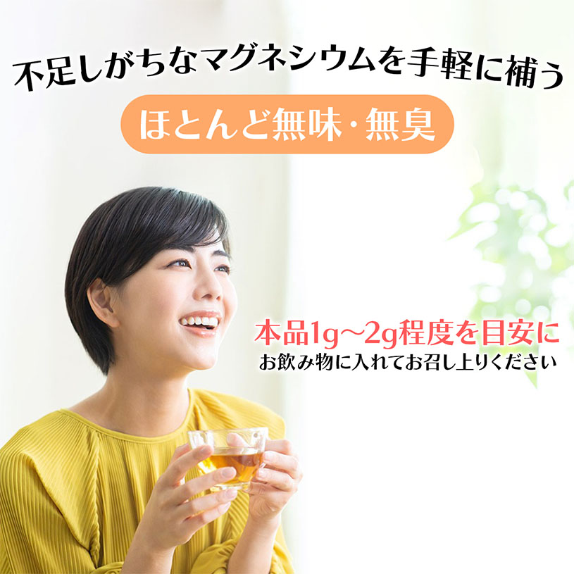 超高濃度 マグネシウム含有 16700mg/100gで、ほとんど無味・無臭。不足しがちなマグネシウムを手軽に補給できます。