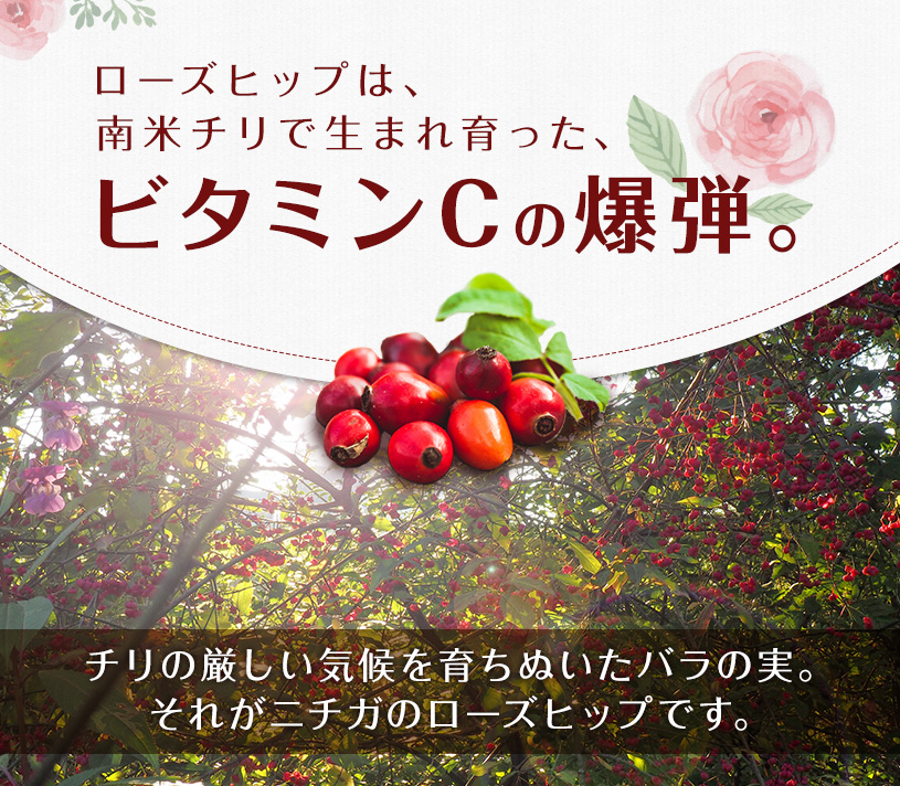 チリ産自生の極上ローズヒップ100%使用。チリの清らかな空気と陽光をたっぷり浴びたローズヒップは、さわやかな香りと独特の酸味、そしてほのかに広がる甘い後味が特徴です。