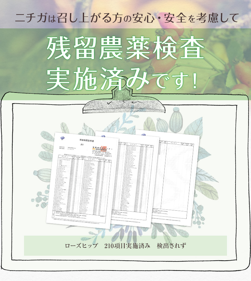 210項目実施済み 検出されず 農薬不使用 ※チリ山脈周辺に自生する野生のローズヒップを使用 |
