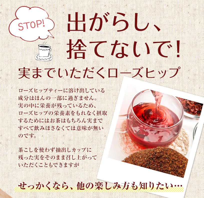 1杯4~8g程度を目安にカップにそのまま入れ、お湯を注いでお飲みください。 量はお好みによりご調節ください。 ○ハチミツを入れていただくと、ローズヒップのコクと相性が良くとても美味しく頂けます。 ○アイスで召し上がりたい場合にはお湯の量を少なくし、蒸らした後に氷を入れてお召し上がりください。 |