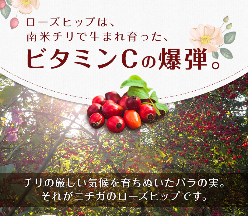 極上のローズヒップは、チリの清らかな空気と陽光をたっぷりと浴びて育ちました。そのため、豊かな香りと独特の酸味、そして後味に広がるほんのりとした甘さが特徴です。自然の恵みをお楽しみください。