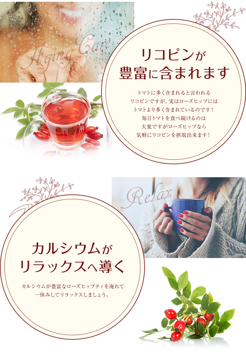 ○まれにローズヒップ由来の葉や茎の部分などが入っている場合がありますが、品質に問題ございません。 ○香りの良いお茶やハーブティーのような自然の食品には虫がつきやすいので、取り扱いに注意が必要です 。 ○天産物を原料とした商品であり、着色料、香料を使用いたしておりません。そのため製造ロットにより風味が異なる場合がございます。予めご了承ください。 ○開封後は湿気に注意してチャックをしっかり閉めて保存し、早めにお召し上がりください。 ○原材料名をご確認の上、食品アレルギーのある方は召し上がらないでください。 ○食生活は主食、主菜、副菜を基本に、食事のバランスを大事にしてください。 |