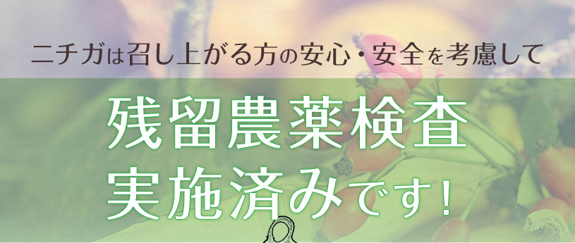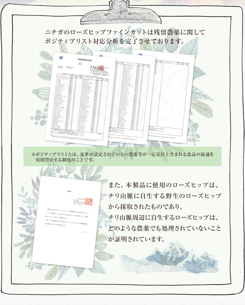 423項目実施済み 検出されず 農薬不使用 ※チリ山脈周辺に自生する野生のローズヒップを使用 |