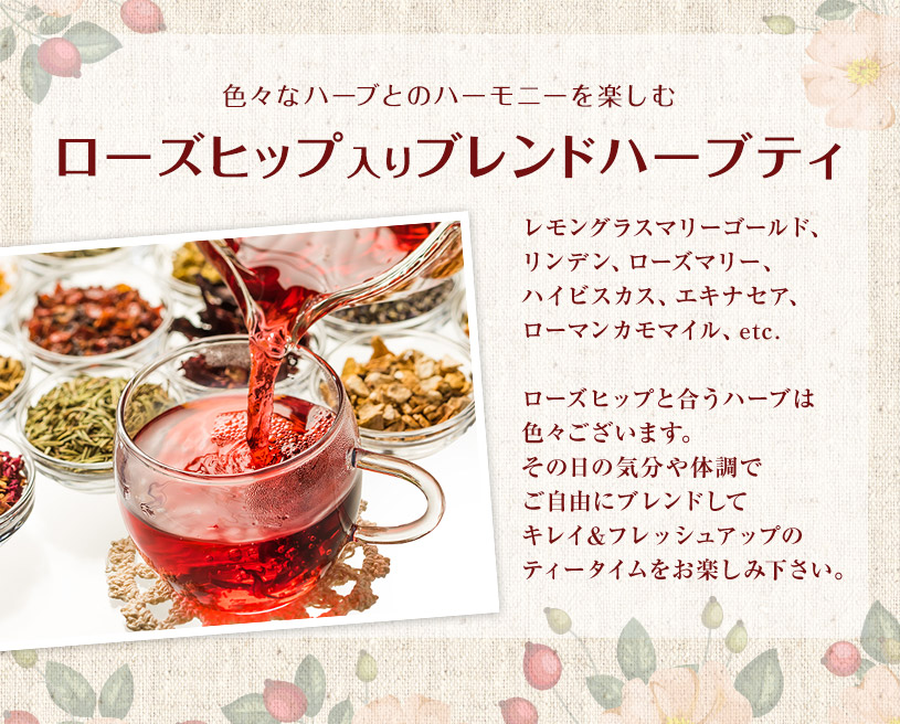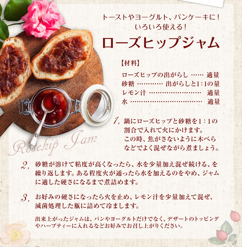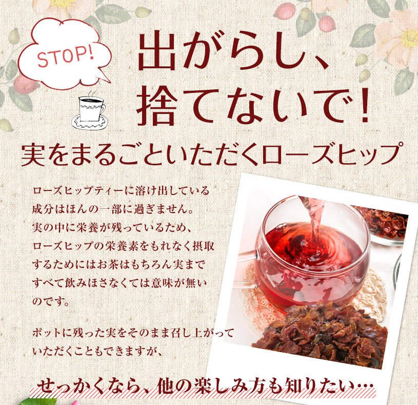 1杯4~8g程度を目安にカップにそのまま入れ、お湯を注いでお飲みください。 量はお好みによりご調節ください。 ○ハチミツを入れていただくと、ローズヒップのコクと相性が良くとても美味しく頂けます。 ○アイスで召し上がりたい場合にはお湯の量を少なくし、蒸らした後に氷を入れてお召し上がりください。 |