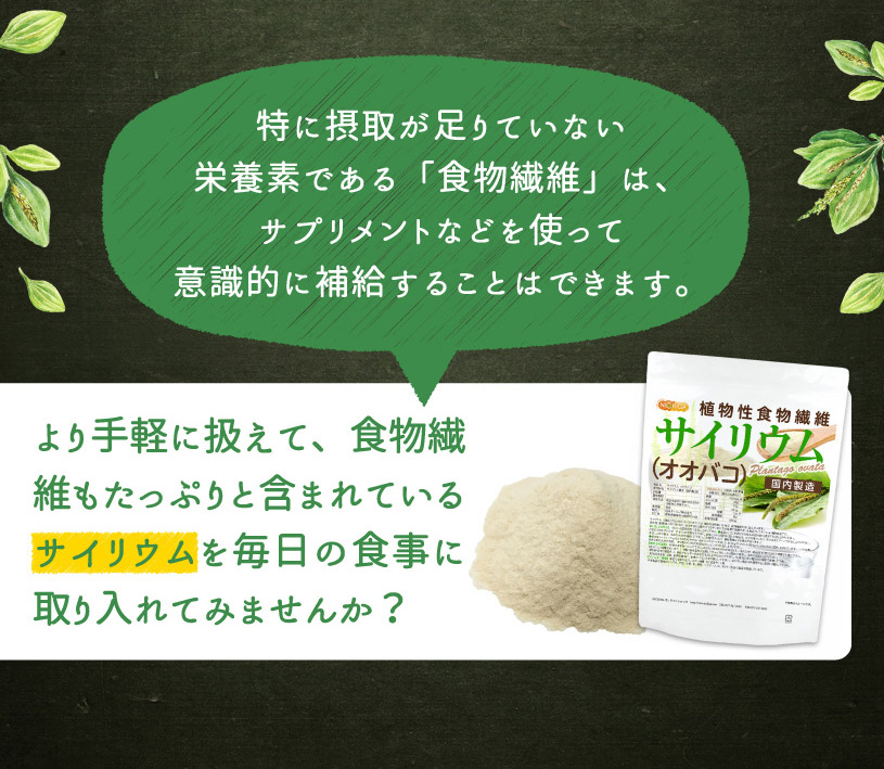 サイリウム(別名:プランタゴ・オバタ/オオバコ)の種子の皮を砕いた物で、食物繊維を多く含んでいます。