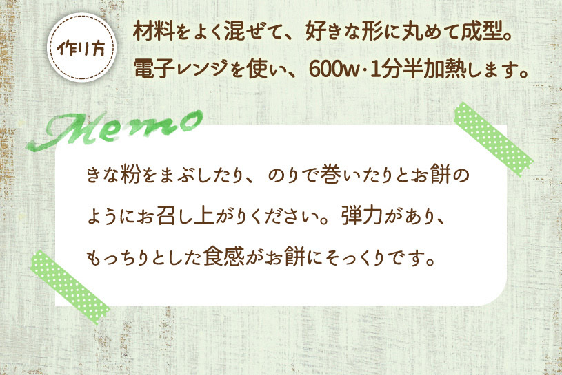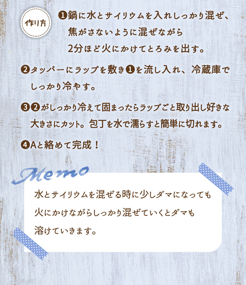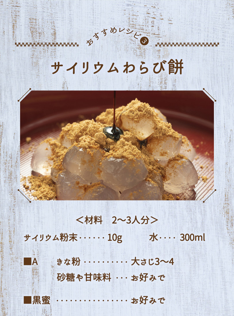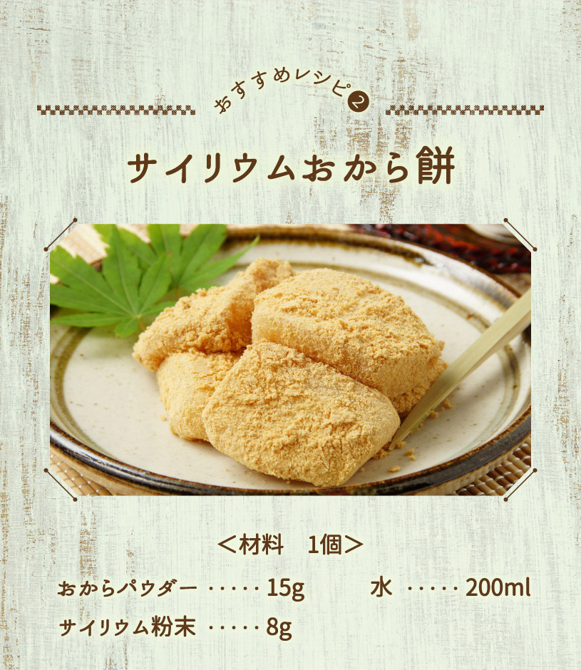 1日2~3回を目安にお召し上がりください。 ○食品として、水またはお好みの飲み物に混ぜてお召し上がりください。 だまになりやすいので、すばやくかき混ぜて下さい。 出来上がりが固めになった場合は、水分を増やしたり、そのままスプーンでお召し上がりください。お召し上がり後は、多めの水分を補給してください。(お腹がはったり、便秘気味になる場合があります。) ○低カロリーサイリウムおからもち <作り方> おからパウダー(大さじ3 約15g)、サイリウム(約8g)、水200mlをよく混ぜる。 600Wで1分半レンジで加熱し、好きな形に丸めて完成。 きな粉やのりなどお好みのトッピングでお召し上がりください。 |