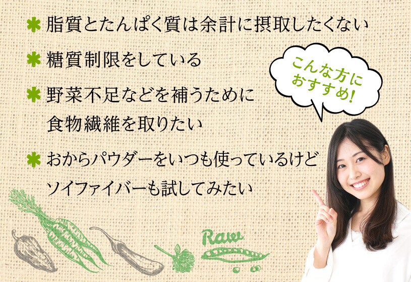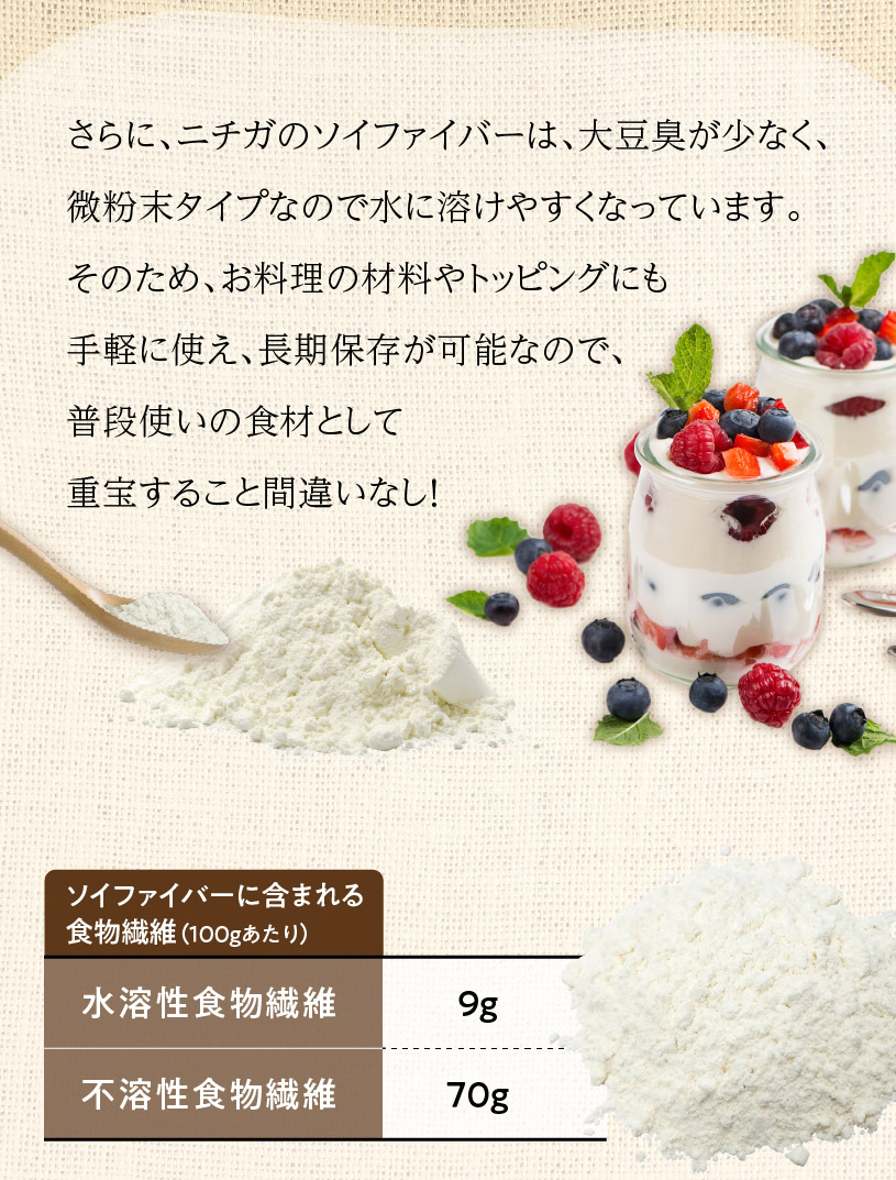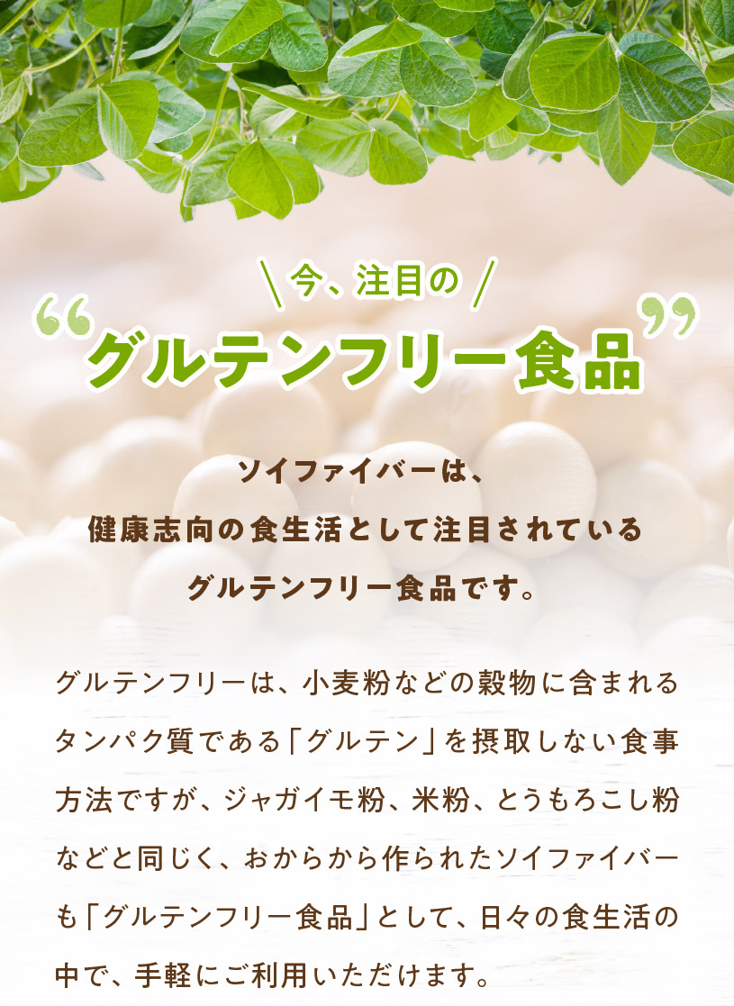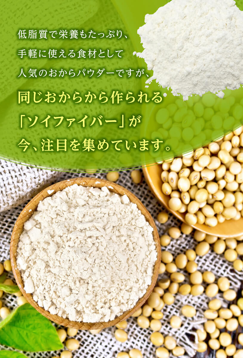 大豆食物繊維(ソイファイバー)は、おからを使って作られた食物繊維です。