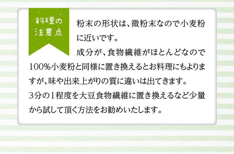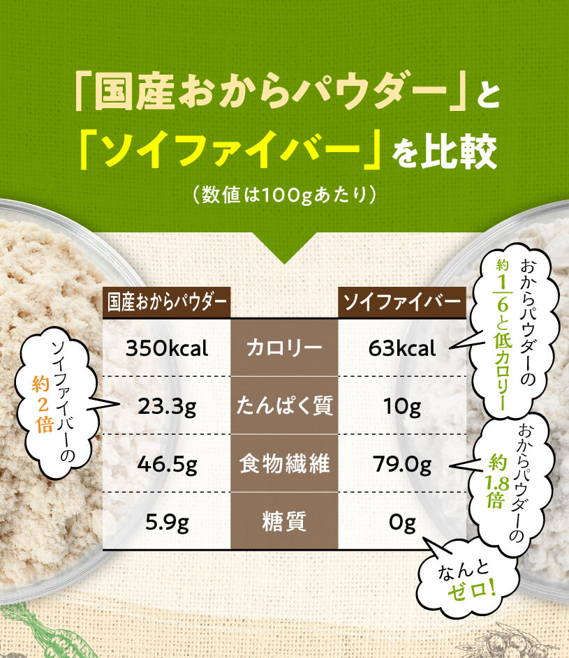 通常のおからパウダーに比べ食物繊維が約1.8倍と豊富、低脂質、糖質0。大豆臭が少なく、微粉末タイプなので水に溶けやすく、お料理にも使いやすいです。通常のおからに比べ長期保存が可能になっております。