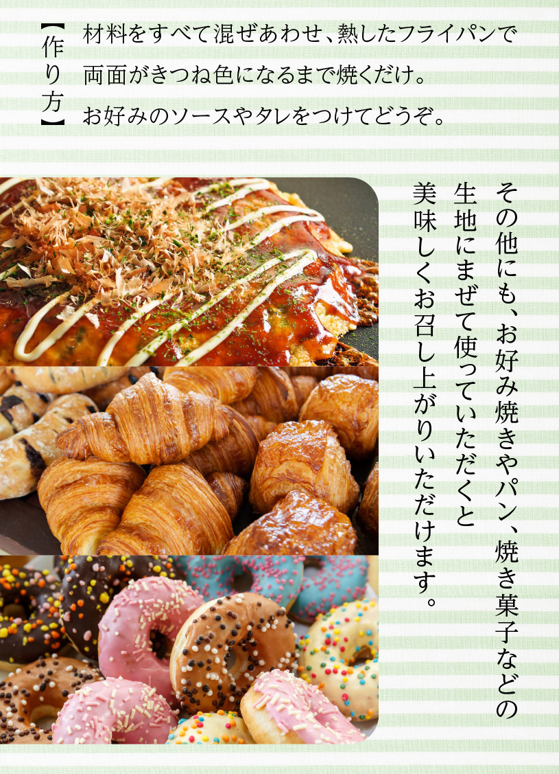 ○デザート、食事、ドリンクなどに入れてお召し上がりください。 ○お好みの生地に適量を入れて混ぜて入れて使いください。 ・過剰摂取にご注意ください。 |
