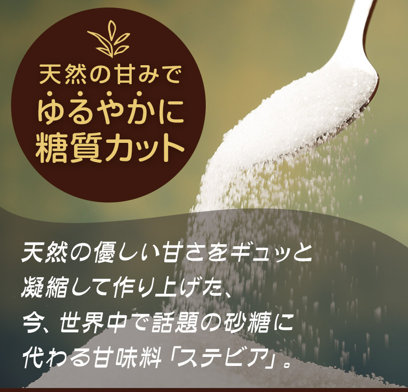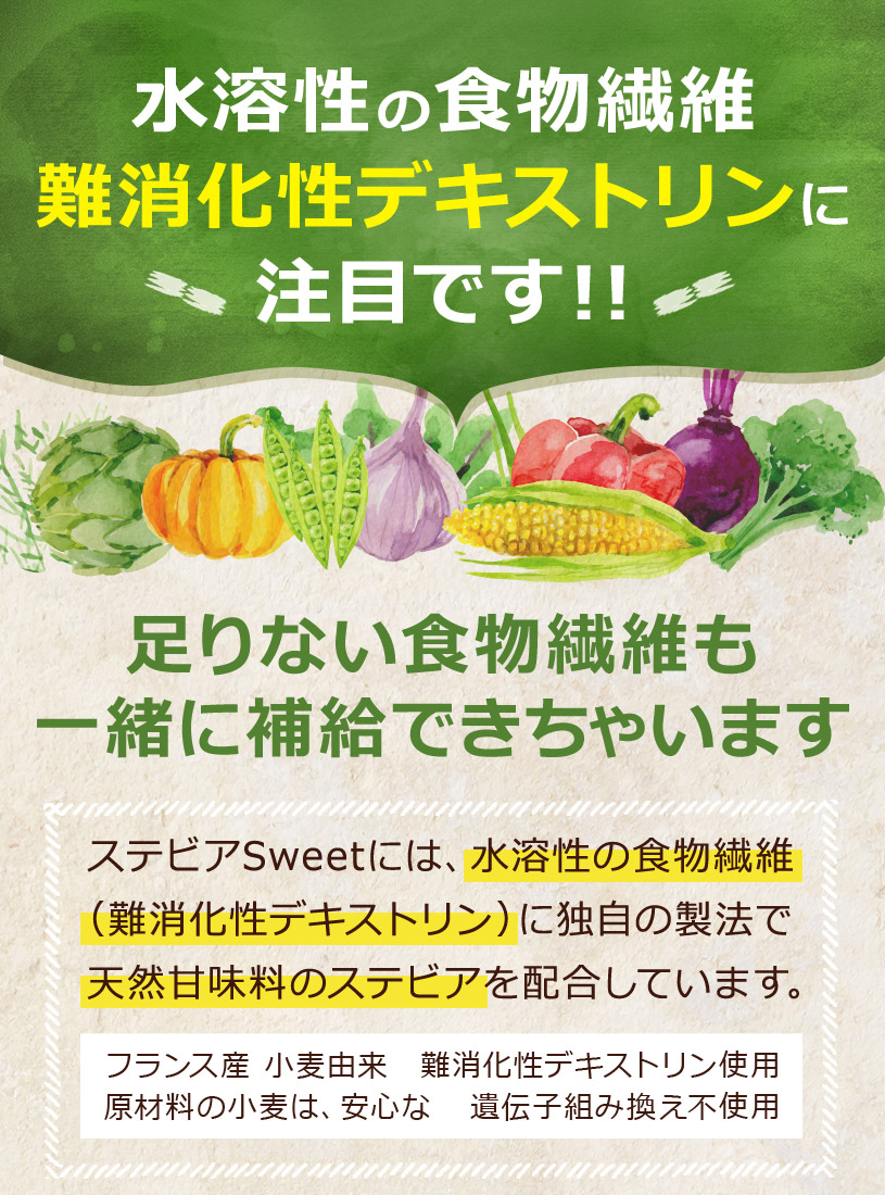 フランス産 難消化性デキストリンに、植物由来のステビア甘味料を独自の新製法にて配合致しました。