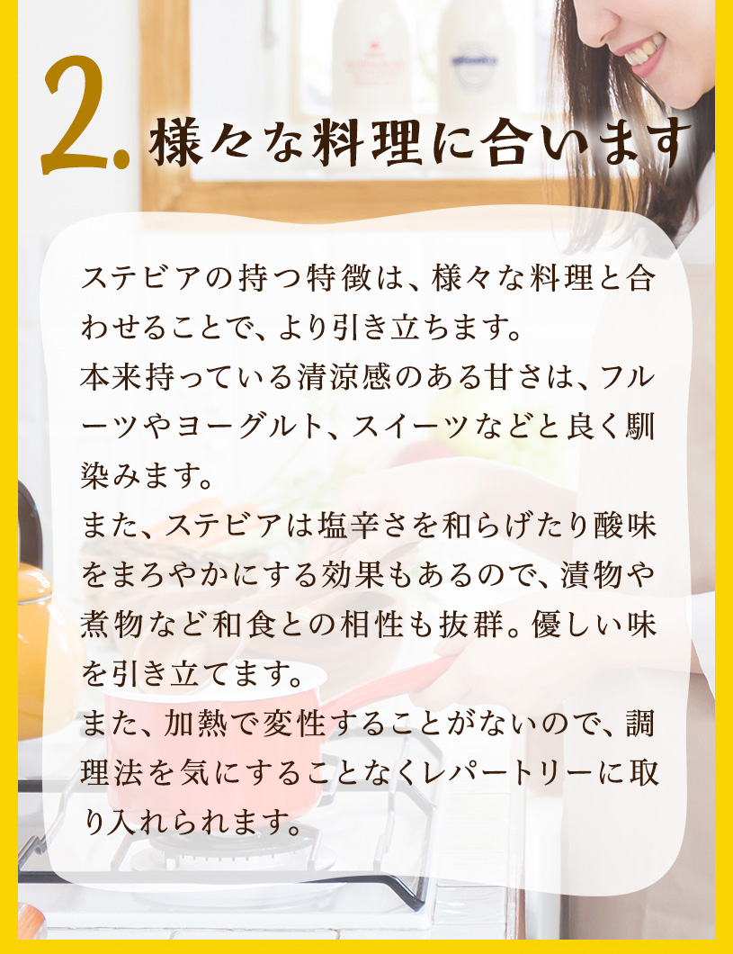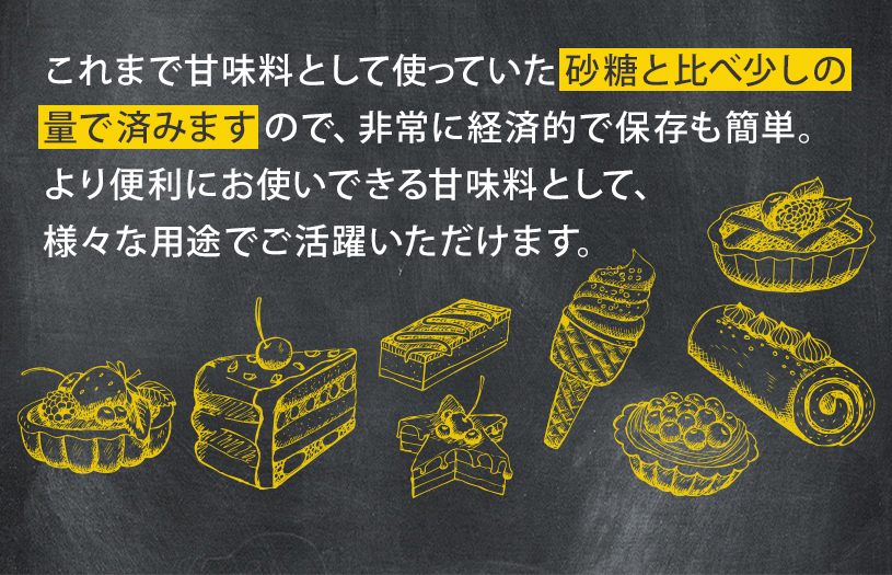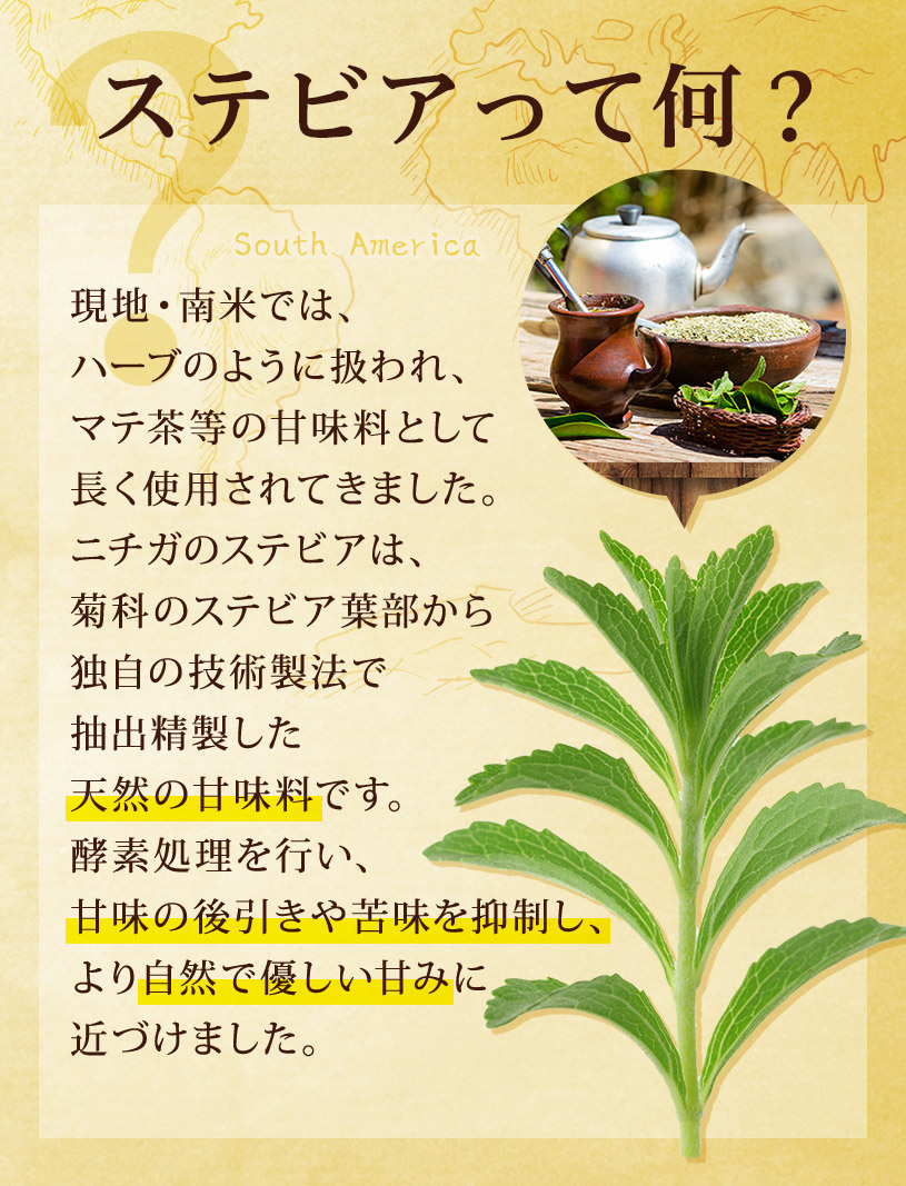 ステビア甘味料は、キク科の植物ステビアの葉から抽出・精製した天然系の甘味料です。こだわりの原料で、保存料・合成甘味料不使用です。