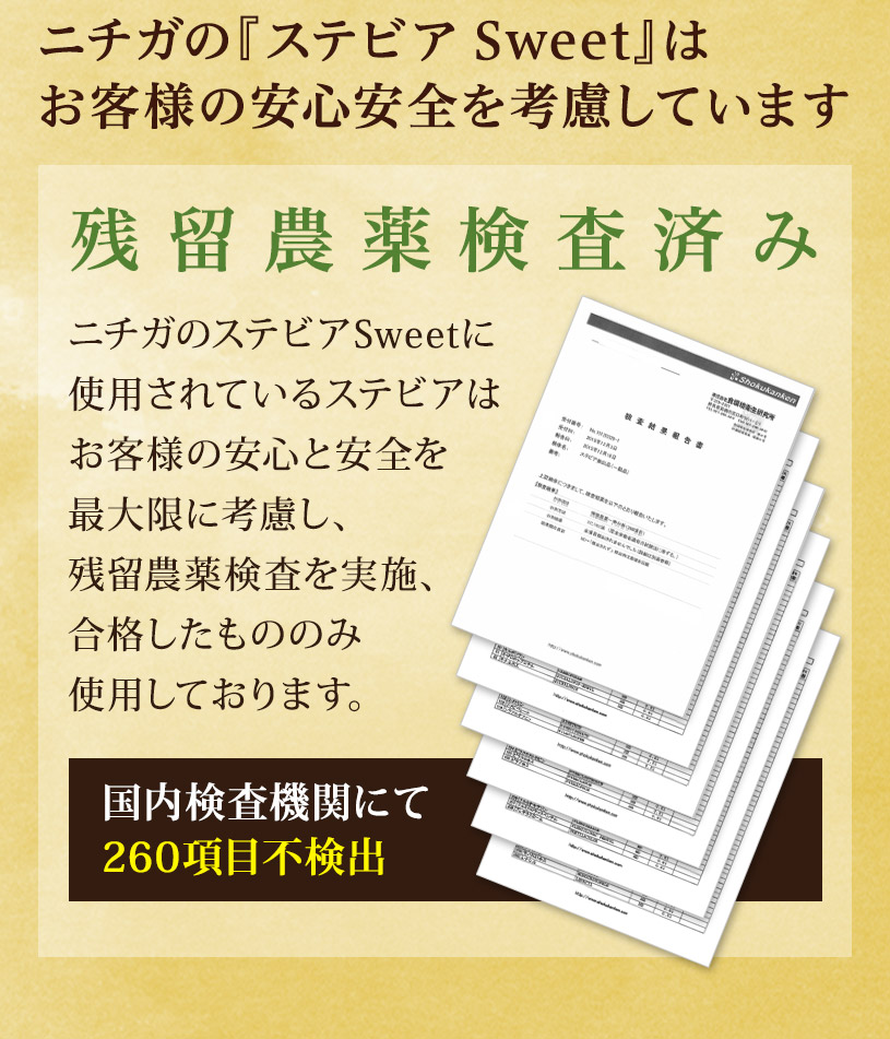 | 残留農薬 | ・ステビア甘味料 国内検査機関にて260項目厚生労働省通知の試験方法にて不検出 |