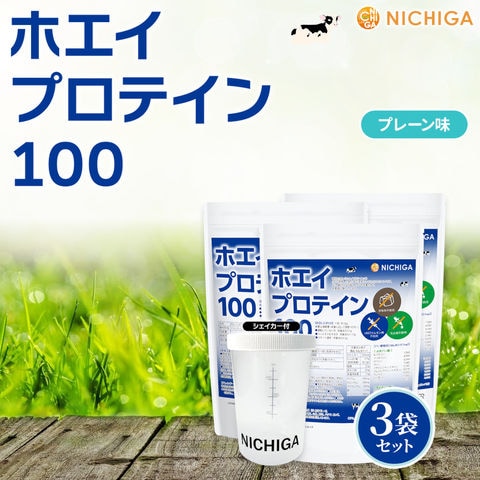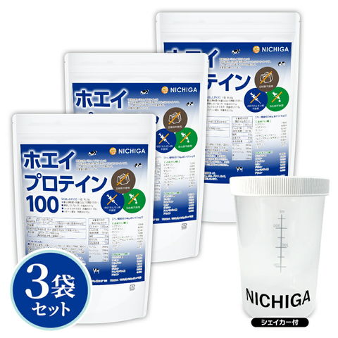 <シェイカー セット> ホエイプロテイン100 1kg×3袋 【送料無料!(沖縄を除く)】 無添加 プレーン味 NICHIGA(ニチガ) TK2