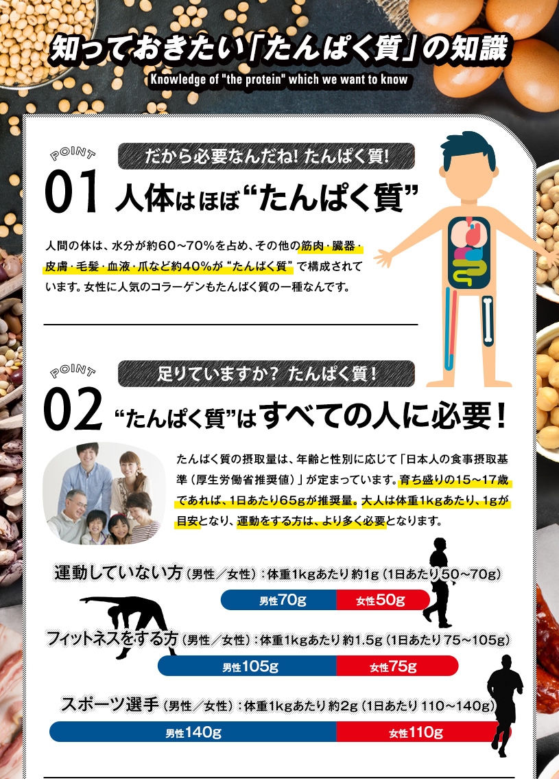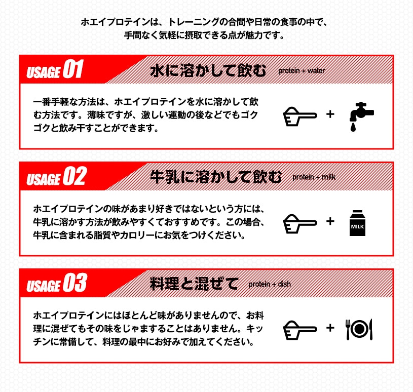 1回 約20g ※量は運動量・体重に応じて調整してください。 ・運動していない方 体重あたり1g ・フィットネスをする方 体重あたり1.5g ・スポーツ選手 体重あたり2g |