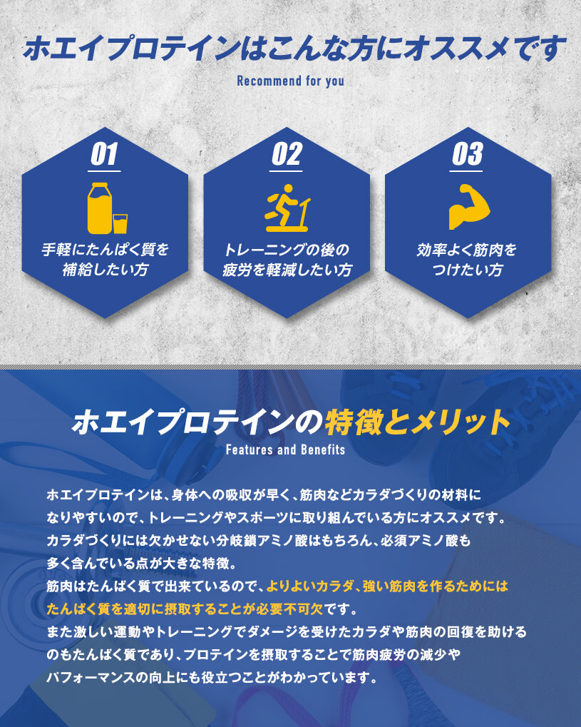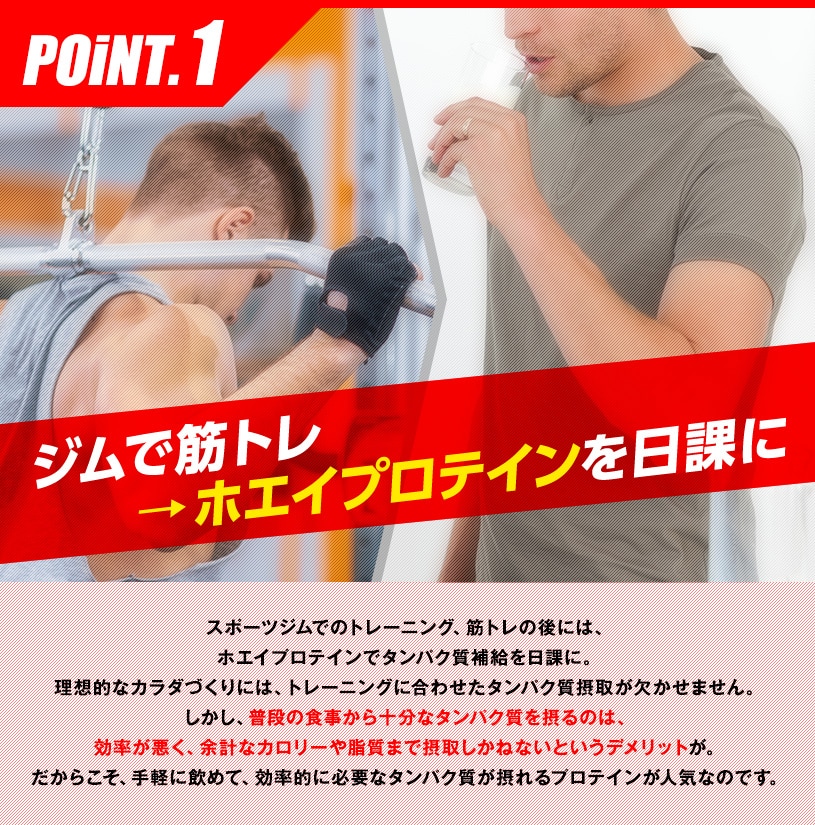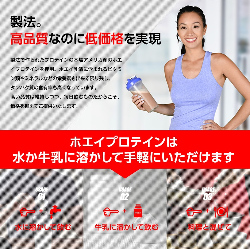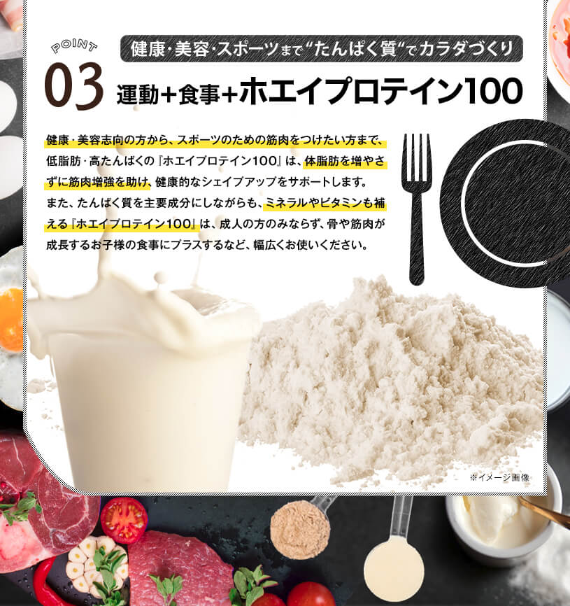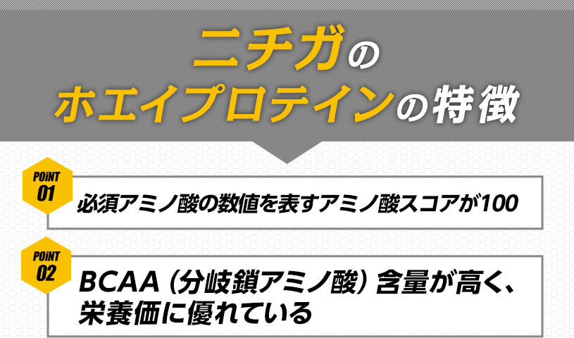 高品質なアメリカ産WPCホエイプロテイン100%使用。吸収率が非常によく、分岐鎖アミノ酸(BCAA)の含有率の高いホエイプロテインは、アミノ酸スコア100と栄養的にも優れたタンパク質です。