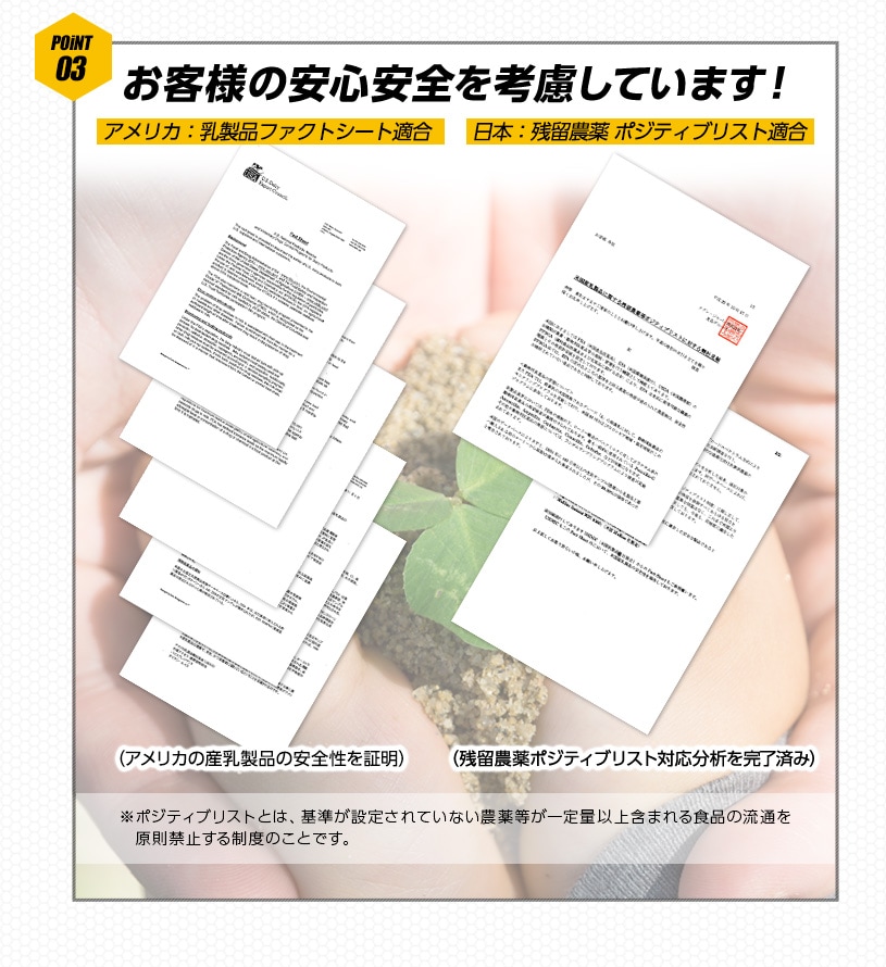 生乳の定期的なランダムサンプリングプログラムにより、農薬や動物用医薬品の乳への農薬の検査を実施しております。 日本の食品衛生法に適合して安全な製品になっております。 |