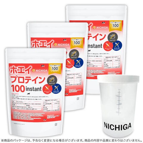 <シェイカー セット> ホエイプロテイン100 【instant】 1kg×3袋 【送料無料!(沖縄を除く)】 プレーン味 rBST (牛成長ホルモン剤不使用) WPC 溶けやすい造粒品 NICHIGA(ニチガ) TK2