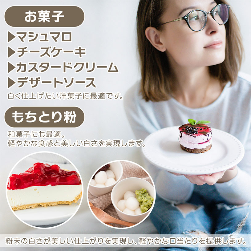 和菓子のもちとり粉や洋菓子のクリーム、お料理のとろみ付けに幅広くお使いいただけます。 また、少量を加えると軽い仕上がりになり、天ぷらの衣に入れるとカラッと揚がります。 白色とうもろこしを原料とし、洋菓子を白く仕上げたい場合に最適です。 |
