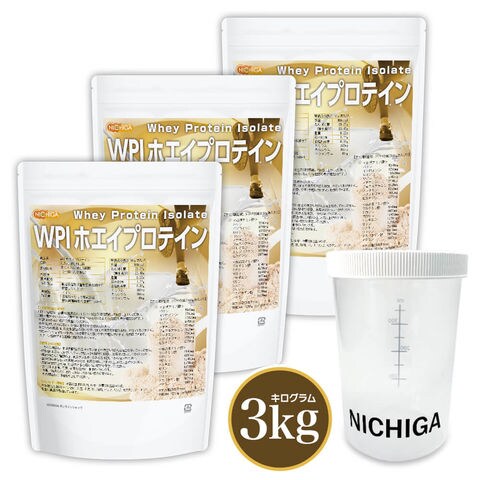 <シェイカー セット> WPIホエイプロテイン 1kg×3袋 【送料無料!(沖縄を除く)】プレーン味 牛成長ホルモン不使用 (人口甘味料・香料不使用・無添加) WPI NICHIGA(ニチガ) TK2