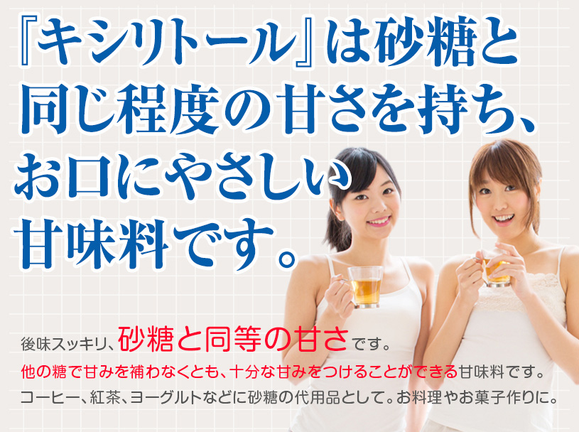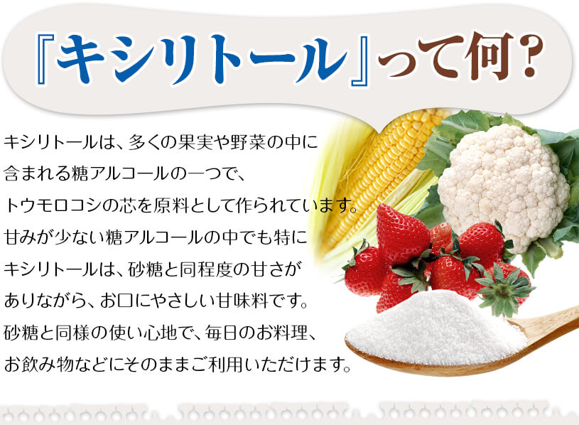 キシリトールは、多くの果実や野菜の中に含まれる糖アルコールの一つで、トウモロコシの芯を原料として作られます。甘みが少ない糖アルコールの中でも、特にキシリトールは、砂糖と同程度の甘さがあり、お口にやさしい甘味料です。