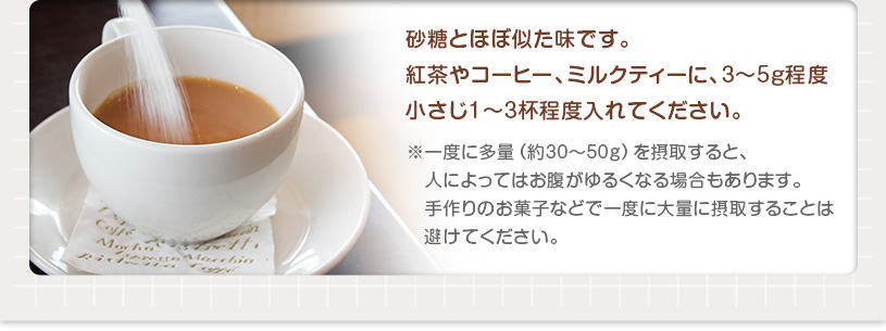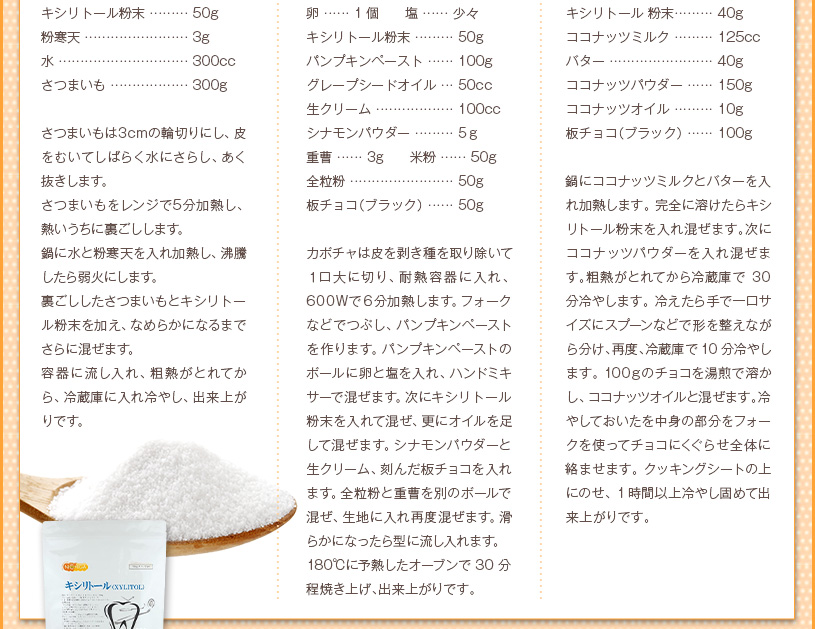 ○砂糖の代用としてお召し上がりください。一度に30g以上の摂取は控えてください。 ○加熱調理しても味を損なわず、お料理やお菓子づくりに活躍します。 ○最近では、キシリトール使用のお料理教室などお料理のお砂糖代わりに大人気です。 |
