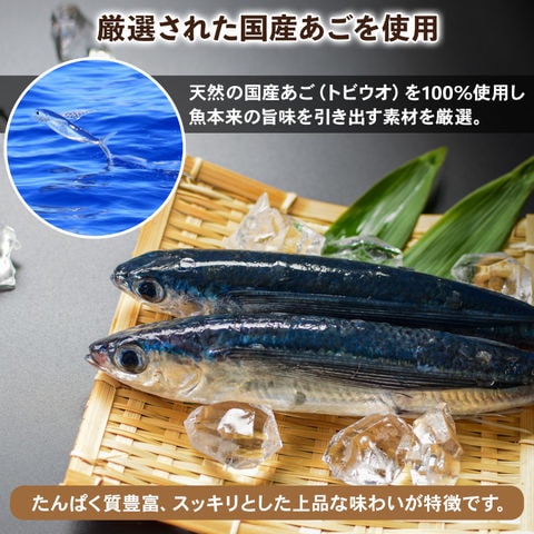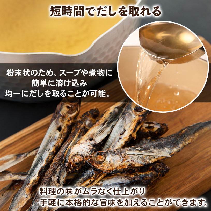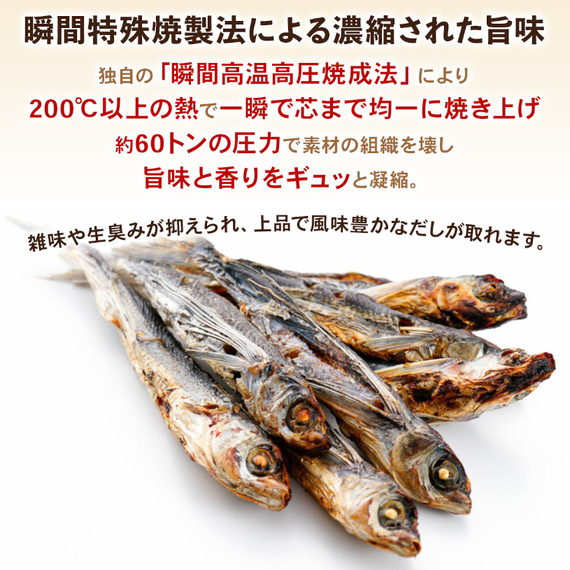 厳選された天然国産あご煮干しを特殊製法で瞬間に焼き上げ、生臭みや雑味・えぐみを抑え素材の持つ「うま味」や「香り」をギュッと凝縮。