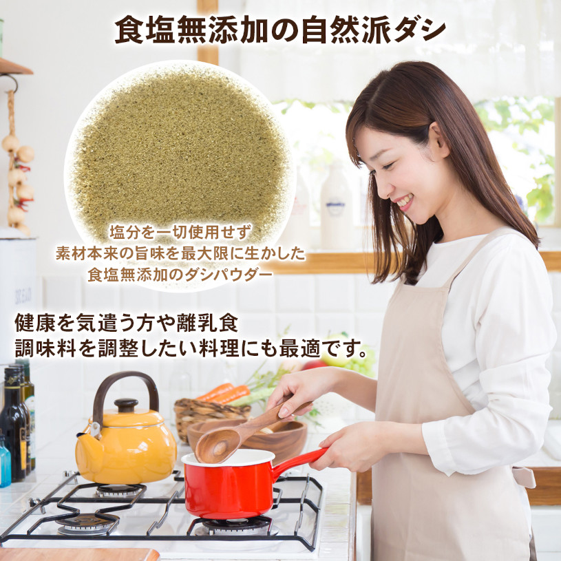 素材の持つ本来の旨味を大切にし、食塩を一切使用せずに仕上げた、自然派のダシパウダー。