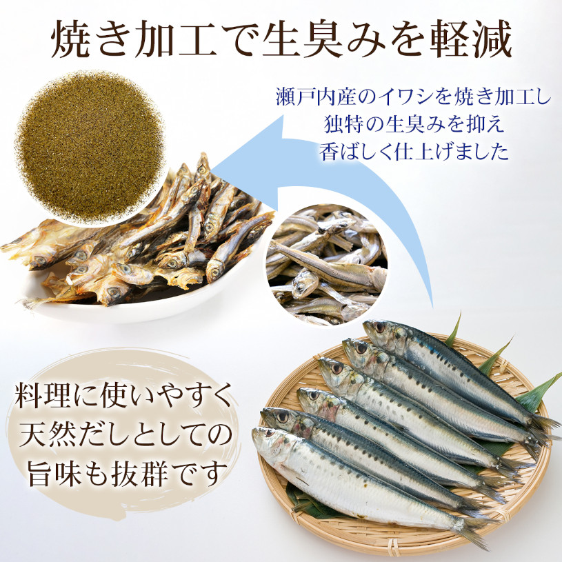 瀬戸内海の豊かな自然環境で育ったイワシを使用し、焼き加工を施した煮干し粉末です。