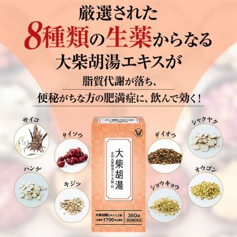 | 商品説明 | ●一般的にストレスや加齢などで肥満や便秘を引き起こすことがあると言われています。「大柴胡湯」は、便秘がちな方の肥満症・常習便秘に、飲んで効く漢方です。 ●8つの生薬から生まれた大柴胡湯エキスを配合しています。 ●この商品は医薬品です。 ●この医薬品は、薬剤師、登録販売者にご相談のうえ、「使用上の注意」をよく読んでお使いください。 |