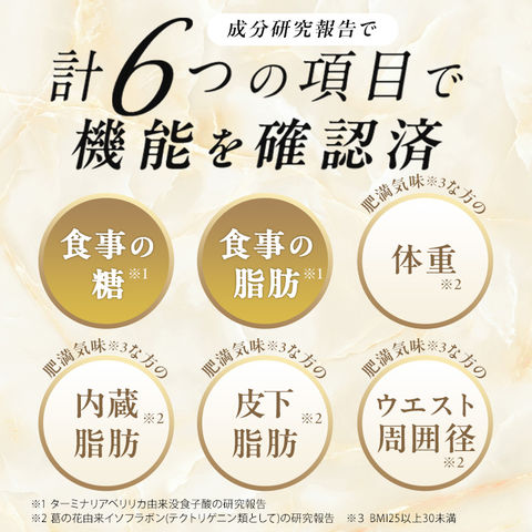 | 効能 | 本品には、葛の花由来イソフラボン(テクトリゲニン類として)が含まれます。葛の花由来イソフラボン(テクトリゲニン類として)には、肥満気味な方の、体重やおなかの脂肪(内臓脂肪と皮下脂肪)やウエスト周囲径を減らすのを助ける機能があることが報告されています。 本品には、ターミナリアベリリカ由来没食子酸が含まれます。ターミナリアベリリカ由来没食子酸には、食事に含まれる糖や脂肪の吸収を抑える機能があることが報告されています。 |