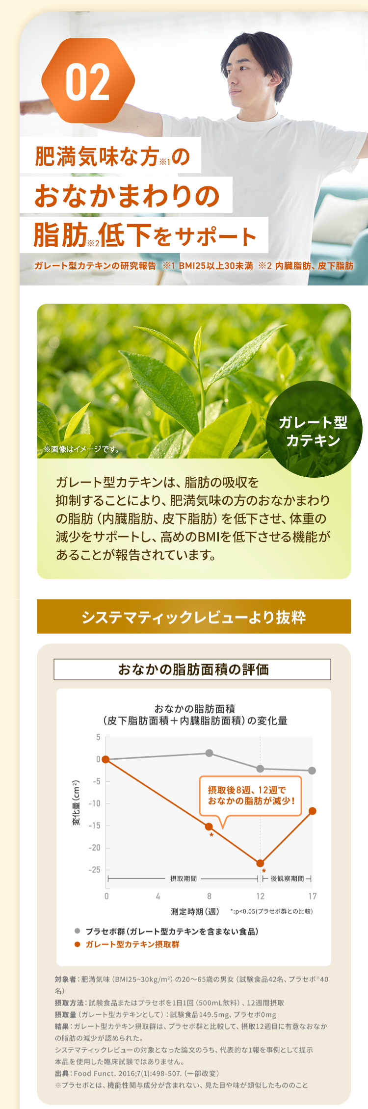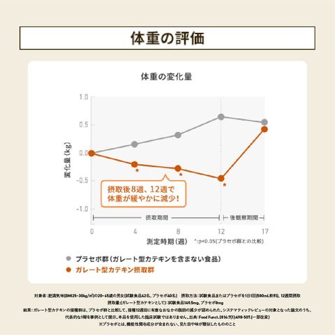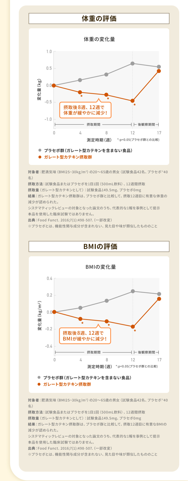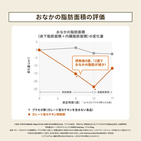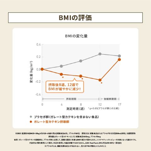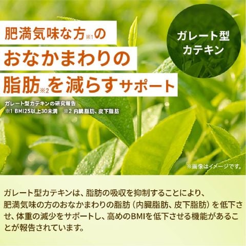 本品にはビフィズス菌8013株(Bifidobacterium longum CLA8013)、ガレート型カテキンが含まれています。ビフィズス菌8013株(Bifidobacterium longum CLA8013)には便秘気味な方のおなかの調子を整える機能が報告されています。ガレート型カテキンには、脂肪の吸収を抑制することにより、肥満気味の方のおなかまわりの脂肪(内臓脂肪、皮下脂肪)を低下させ、体重の減少をサポートし、高めのBMIを低下させる機能があることが報告されています。