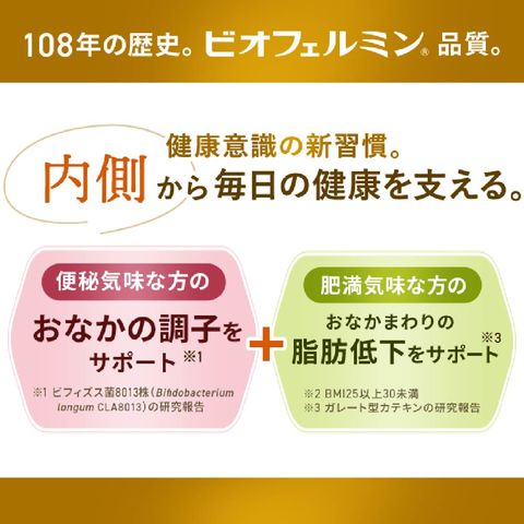 | 届出表示 | 本品にはビフィズス菌8013株(Bifidobacterium longum CLA8013)、ガレート型カテキンが含まれています。ビフィズス菌8013株(Bifidobacterium longum CLA8013)には便秘気味な方のおなかの調子を整える機能が報告されています。ガレート型カテキンには、脂肪の吸収を抑制することにより、肥満気味の方のおなかまわりの脂肪(内臓脂肪、皮下脂肪)を低下させ、体重の減少をサポートし、高めのBMIを低下させる機能があることが報告されています。 |