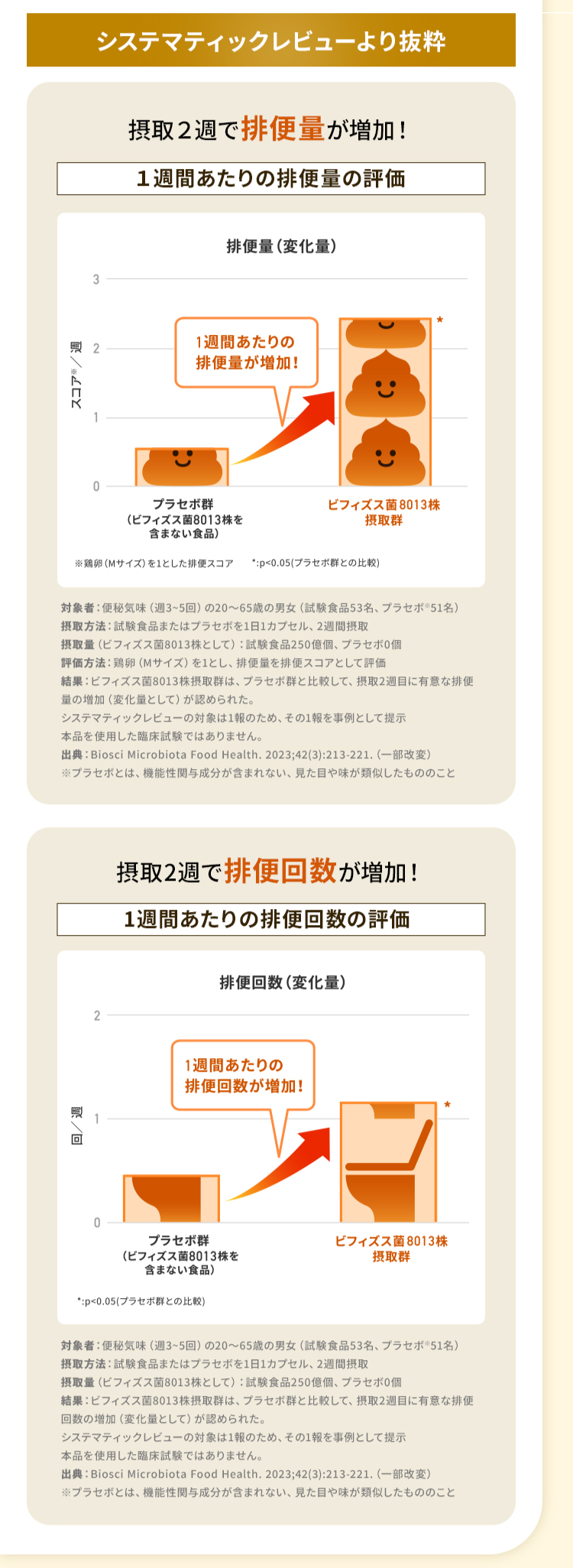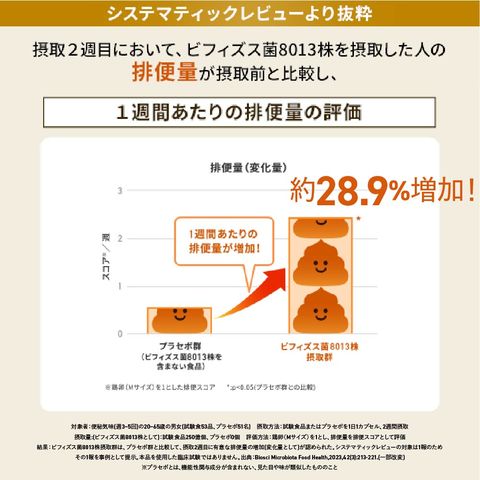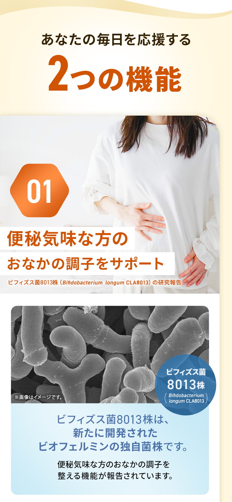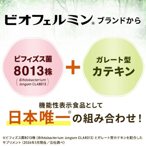 | 機能性関与成分 | ビフィズス菌8013株(Bifidobacterium longum CLA8013) 250億個 ガレート型カテキン 150mg |