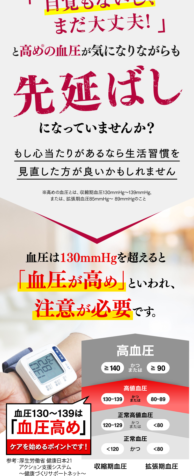 本品にはヒハツ由来ピペリンが含まれています。ヒハツ由来ピペリンには、加齢とともに低下する血管のしなやかさ(血管を締め付けた後の血管の拡張度)の維持に役立つ機能が報告されています。また、血圧が高めの方の血圧を下げ、正常な血圧を維持する機能が報告されています。