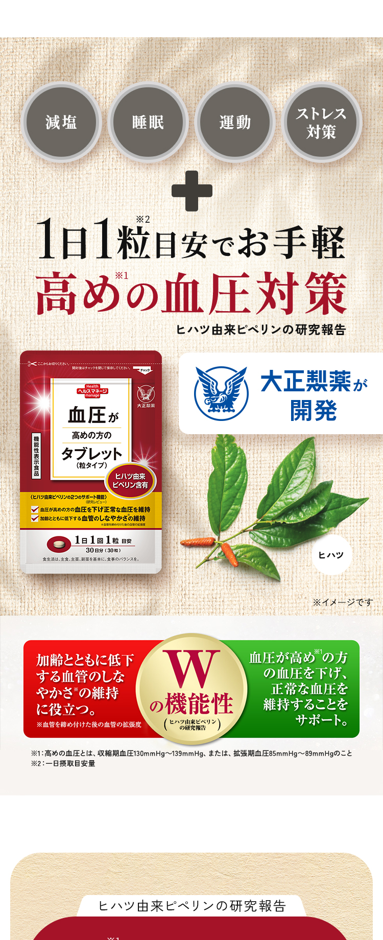 | 届出表示 | 本品にはヒハツ由来ピペリンが含まれています。ヒハツ由来ピペリンには、加齢とともに低下する血管のしなやかさ(血管を締め付けた後の血管の拡張度)の維持に役立つ機能が報告されています。また、血圧が高めの方の血圧を下げ、正常な血圧を維持する機能が報告されています。 |