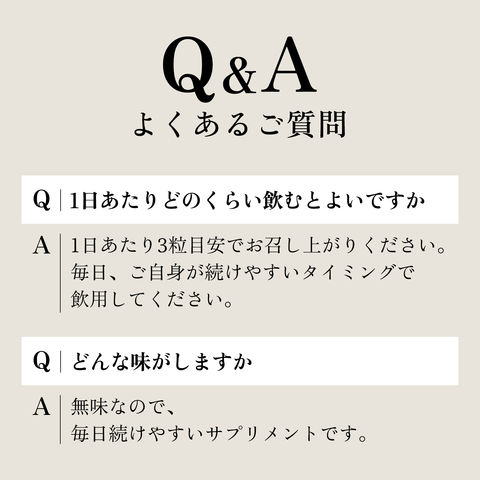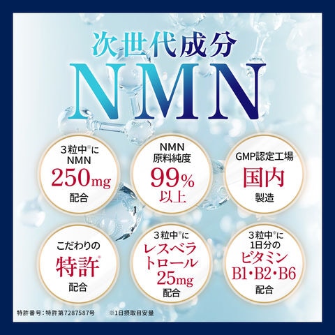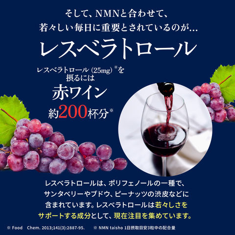 | 栄養成分表示 | エネルギー:4.0kcal たんぱく質:0.15g 脂質:0.04g 炭水化物:0.75g 食塩相当量:0~0.01g ビタミンB1:5.0mg ビタミンB2:5.0mg ビタミンB6:5.0mg NMN:250mg レスベラトロール:25mg エラグ酸:100mg |