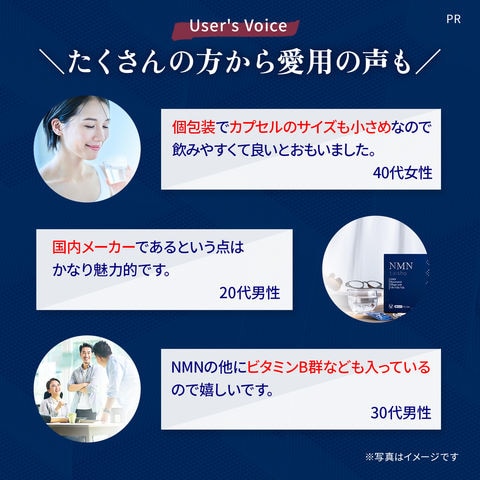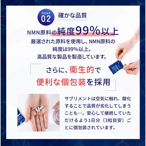 | 原材料名 | でん粉分解物(国内製造)、NMN、ザクロ抽出物、ブドウ果皮抽出物/HPMC、ステアリン酸Ca、微粒酸化ケイ素、V.B6、ゲル化剤(ジェラン)、V.B1、V.B2、着色料(酸化チタン) |