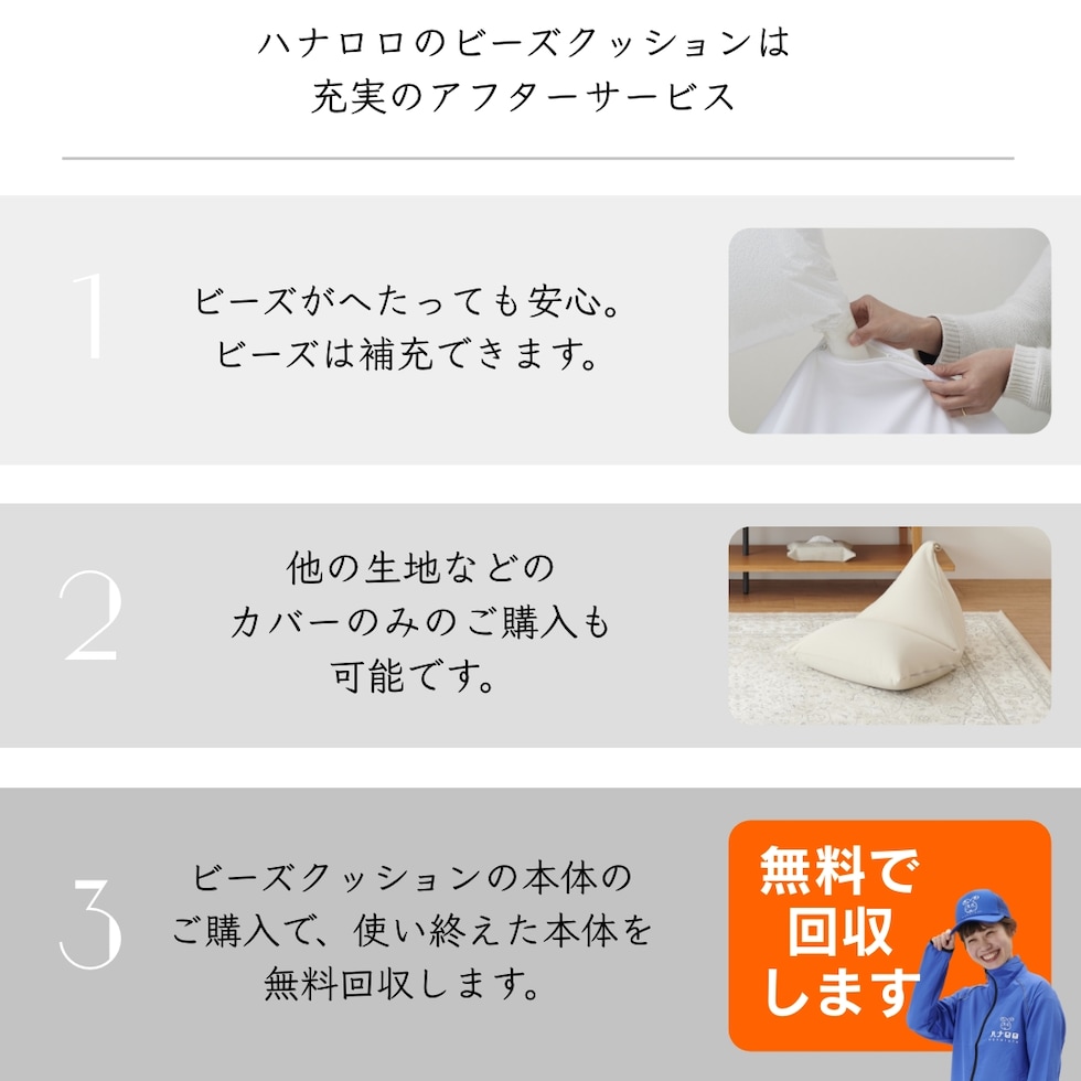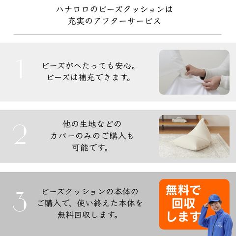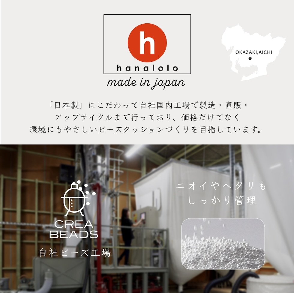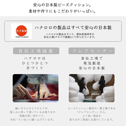 ■ハナロロのビーズクッションは、ビーズの臭いをとるために、一週間ほどたってから製品化しておりますが、気になる方は風通しの良い場所で陰干ししてご使用ください。